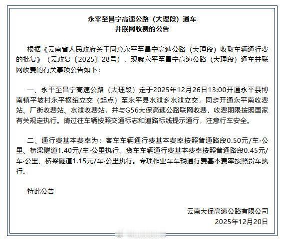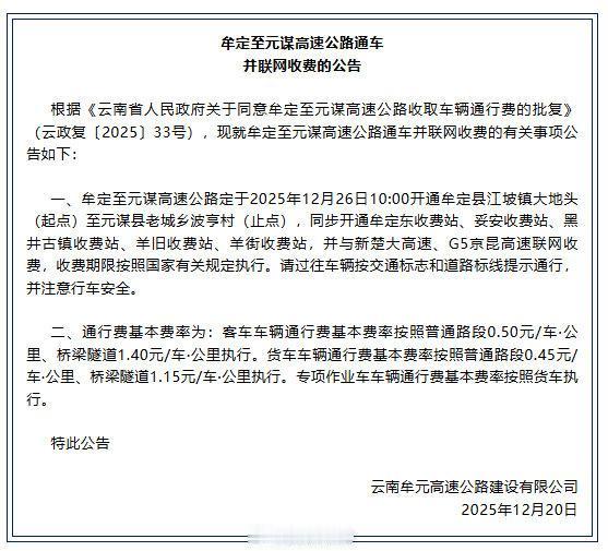 云南交通又传来好消息!【好消息!云南两条高速公路即将同日通车 】12 月 26 日,牟定至元谋高速公路 10:00 通车,永平至昌宁高速公路(大理段)13:00 通车。 牟定至元谋高速开通牟定县江坡镇大地头至元谋县老城乡波亨村路段,同步开通多个收费站,还与新楚大高速、G5 京昆高速联网收费。其客车普通路段通行费 0.50 元/车·公里、桥梁隧道 1.40 元/车·公里;货车普通路段 0.45 元/车·公里、桥梁隧道 1.15 元/车·公里。这两条高速通车后,出行更便捷,想去云南游玩的朋友有福啦! 云南高速公路 交通