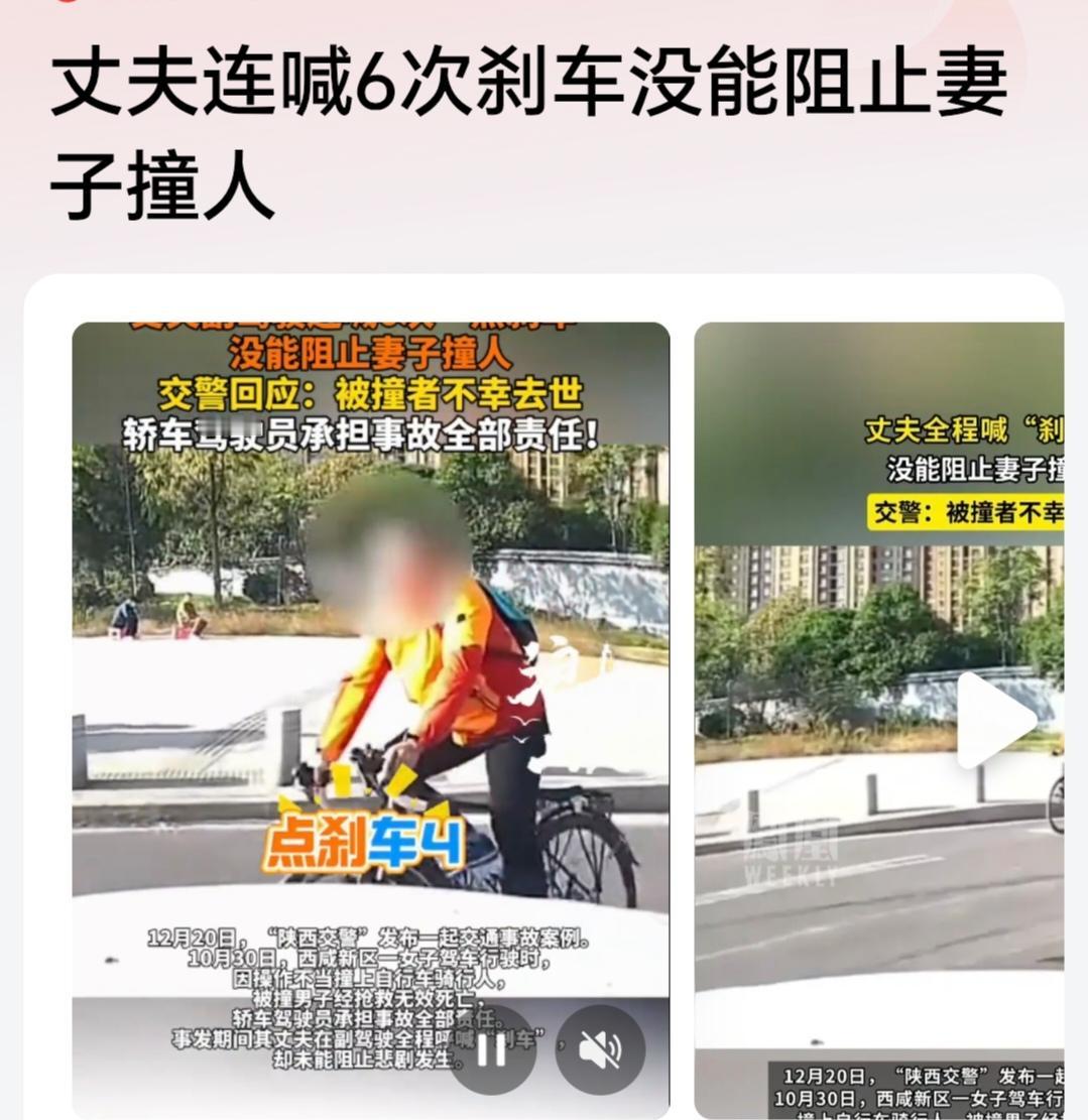 这不是“操作不当”,简直就是不会开车,甚至说是故意杀人了吧! 12月20日,陕西交警公布一则交通事故案例:西咸新区一女子驾车时操作不当,径直撞上一名骑自行车的男子,结果造成男子抢救无效身亡。 从开车女子的行车记录仪清楚的看到事故发生时的录像,当时远远的就看到自行车的男子了,坐在副驾驶上的丈夫大声提醒司机妻子“点刹车”。 结果妻子虽然听到了,而且还看到越来越近的骑车男子,但是妻子没有踩下刹车。 听到丈夫急促的,一声又一声的催促她“踩刹车”,但是妻子也急了,说出一声“没有”。 估计当时她的大脑已经空白了,手脚张开,任由汽车自由运动了。 在丈夫的恐慌中,女子尖叫的“哎呦、哎呦”了几声,直接就把骑车人给撞倒了。 丈夫愤怒的又喊了两声“点刹车,点刹车吗”! 一共喊了6次踩刹车,但是司机一次都没有踩下,根据车速看到,她也没有点下油门,就是双脚都离开了两个装置。 从汽车行进的方向来看,当前面发现有人的时候,汽车方向盘都没有转动,一直朝前方行进。 这个女司机估计刚刚拿到驾照,或者是还在练车阶段,根本就不大开过车。 骑车的人非常倒霉,被一个新手女司机给撞倒了,而且还抢救无效去世了。 这根本就不是“操作不当”,应该算是精准的“过失杀人”了吧,男子的家人该有多痛苦呢? 本来不应该发生的事故,男人也不会受伤,就是有这样的新手女司机,让男人丧命。 交警说轿车驾驶员承担事故全部责任,但是希望也要处罚她的驾照学习的驾照和考试部门,这样的人怎么能结业拿到驾驶证呢? 大家说不对吗?