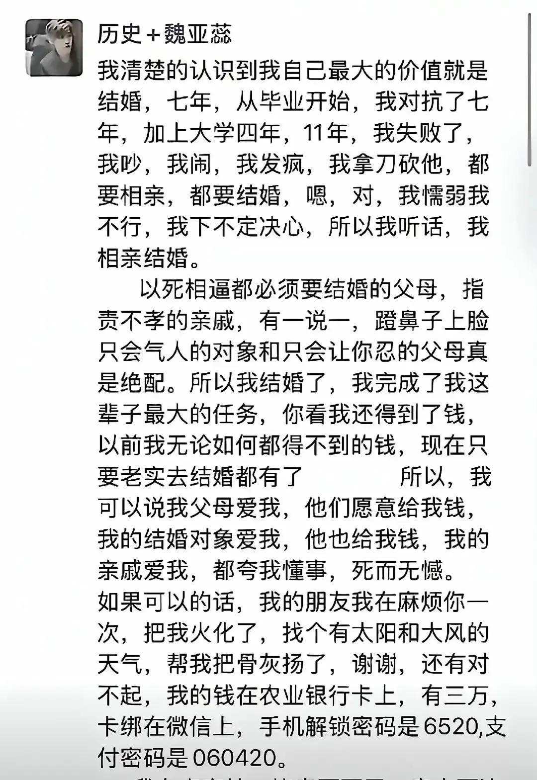 看完河南鲁山新娘的遗书,我想说,一个文化人,一个教书育人的青年教师,在21世纪的今天,竟然还以这种方式去抗争包办婚姻,实在是社会的悲哀。 同时也给所有未婚女性上了一课。 不想结婚可以不结,不管怎么做,但绝不能用这种方式对抗。 我合上遗书,第一反应是去她学校。历史组的老王说,她两周前还在备课,嘴里总念叨“人要有退路”。遗书最后一页有一串名单:妇联热线、法律援助、一个朋友的地址。她不是没路,她没迈出去。 我又去找她闺蜜小雪。小雪给我看聊天记录:她试过订外地的夜班车,家里查到行程拦下;她试过把婚期往后拖,用“学校安排”当理由,被亲戚堵在家门口。她说“我不想让谁受伤,但我需要活法”。这句话我记下来。 其实选择很多。小雪后来真的走了。她把手机号停掉,带着临时证先去外地找短工,再投简历。半年后,她在杭州一家教育机构站稳了。家里骂她,后来也就认了。她跟我说:离开不是叛逆,是给自己一条命。 我在她家楼下站了很久。有人把喜字撕了,有人把花搬走。邻居低声说,她前一晚还去附近超市问兼职,谁都没想到她会这样收尾。婚车停在路口,司机发了条朋友圈:今天的太阳很冷。我不再看这些图,它们只会让人更难受。 写到这,我更想问正在被催婚的人:你的“B计划”准备好了吗?有没有一个能随时去的地方,一个愿意收留你的朋友,一份对自己负责的清单。不要把希望全压在别人身上。去找法律援助,去社区妇联,去你信任的老师。不是一条路走不通,就没有路。 她遗书里留了一个悬着的问句:我如果走了,会不会有人理解?答案也许永远没有,但理解不重要,活着才重要。面对压迫,最硬的反击是活成自己的样子。你不欠谁一场婚礼,你只欠自己一次转身。 我把那份热线抄下来发给更多人。也许有人正需要。也许有人看完,会把票订下。真到了那天,你会选留下,还是选走?你准备好的那条路,叫什么名字?