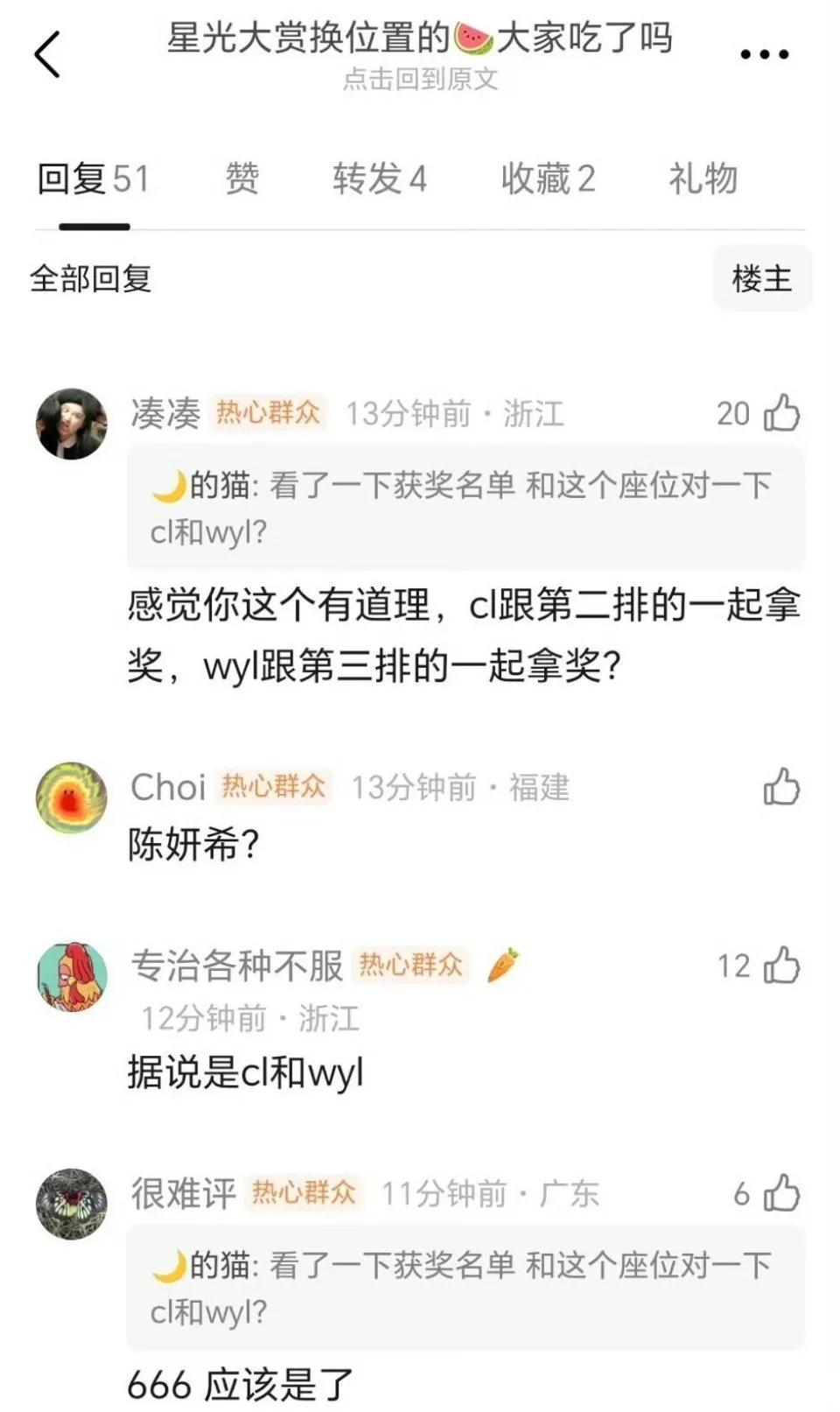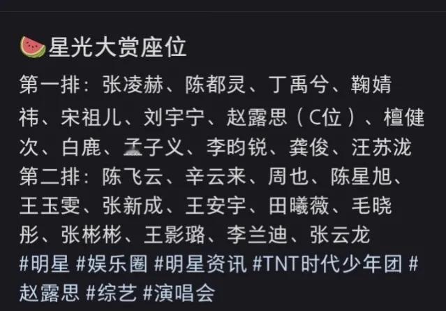 丞磊星光大赏疑似被换座,曝王影璐抢丞磊位置? 昨晚好多人都在说丞磊的咖位真不至于这么低,昨晚的星光大赏内场座位图显示:李昀锐和孟子义坐在一起,丞磊被安排在第三排,赵露思稳坐第一排C位,另一对大热CP刘宇宁和宋祖儿也被安排坐在了一起,看了一下这个座位安排,基本就是按照咖位大小排的。 第一排的艺人明显都是大热流.量演员,而第二排的艺人不论是流.量还是实绩都不如第一排,第三排就更别说了,丞磊真不至于只能坐在第三排?有网友曝是王影璐的团队下场,换了丞磊的位置。 造谣一张嘴真是服气了,要不找出最开始的位置看看呢!人家女演员的位置一直没变哈,有问题不如问问腾讯的主办方! 首先因为丞磊的实绩和流.量不行,他今年播了三部剧,除了《锦月如歌》其他都不咋样,还有就是尖叫之夜丞磊的位置,因为没有男主实绩,所以他的位置甚至都不如敖瑞鹏,算是背对着舞台的。 所以演员还是要看实绩流.量,就像昨天白鹿的位置,她八年没在腾讯播剧了,但她的位置也是第一排,走红毯顺序也是很靠后,是倒数第三位,就因为她是有实绩流.量的,就算她八年没在腾讯播剧,主办方都要给她发一个“年度号召力艺人”的奖项~ 丞磊的咖位也不大,今年又没飞升很正常啊,陆毅还在第二排呢找谁说理去?这也是看作品和人气的,不只看咖位,别听风就是雨的。