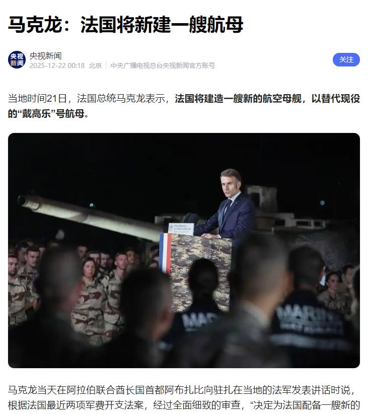 法国有了新动作!号称能对法国经济起到直接的拉动作用! 12月21日的时候,法国总统马克龙在阿联酋表态,要造一艘新航母替换现在的“戴高乐”号,还说这个大项目能直接拉动法国经济。 在我看来,造航母保国家安全没问题,但想靠它带经济,根本不现实,大概率还会拖经济后腿。 先说说法国自己的教训,就说现在这艘“戴高乐”号航母,2001年服役至今,当初造的时候就没拉动经济,反而让财政亏了一大笔。 原本计划1996年就能用,结果因为技术问题拖到2001年,工期多了5年,预算超了几百亿欧元。 服役后还老出毛病,年年维护费都不少,普通老百姓没捞着半点好处,经济该差还是差,失业率也没降。有过这前车之鉴,还指望新航母拉经济,纯属好了伤疤忘了疼。 再看这次要造的新航母,更是个烧钱的大家伙,根本没能力拉经济。这航母7.8万吨级,要用到2038年才能替换旧的,从现在开始造要等13年,这么长时间,所谓的经济拉动效应早没影了。 更关键是花钱太多,单艘造价就102.5亿欧元,算上配套投入总共要花200多亿欧元,差不多是法国一年国防预算的五分之一。 现在法国经济本就扛不住,欧盟预测2025年法国债务占GDP的117%,赤字也远超欧盟标准,这么多钱投进去,要么借债要么砍民生开支,怎么都是拖经济。 有人可能会说,造航母能带动上下游企业,马克龙也说能惠及800家供应商。但事实是,军工产业跟民用产业不搭边,带动效果特别有限。 就像德国近年加大军工投入,经济学界都不认可,说靠借债搞军工只会让经济变慢。 说白了,投1欧元军费,经济只能多产出50欧分;但投在民生、基建上,能多产出1到2欧元,差距太大。就算这项目能让800家供应商赚钱,也只是少数人受益,跟整体经济没关系。 现在法国经济本身就不好,三季度失业率7.7%,不少人没工作,老百姓也不敢花钱。 这种时候不把钱花在提高收入、改善民生这些实在地方,反而砸几百亿造航母,完全搞反了方向。放眼全球,也没哪个国家靠造航母拉成经济的,航母就是烧钱的,不是赚钱的。 所以说,马克龙想靠新航母拉经济,就是一厢情愿。这航母又费钱又耗时,解决不了法国当下的经济问题,还可能拖后腿。 造航母保安全没问题,但想靠它救经济,找错了方向,最后大概率竹篮打水一场空。