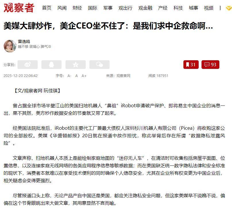 “美媒能不能别乱发了!是我们求的中企救命啊......” 据媒体12月20日报道:最近美国扫地机器人“鼻祖”iRobot要被中国企业收购的消息闹得挺热闹,可美媒又开始瞎忽悠,说什么“数据不安全”,搞得好像中企是来抢地盘似的。 这纯属睁着眼睛说瞎话,人家iRobot的CEO都忍不住出来澄清了:是公司快倒闭的时候,他主动找的中国深圳杉川机器人求收购的。 说白了就是美企走投无路找救星,中企伸了把手,美媒却故意颠倒黑白,真让人看不惯! 可能有人不知道,iRobot以前多风光,全球扫地机器人市场一半都是它的,妥妥的行业老大。可近几年是一路亏,亏得实在撑不下去了,只能申请破产保护。 美国本土企业找了个遍,没一个愿意帮忙的,CEO急得团团转,员工工资都快发不出来了。 这时候他想到了杉川机器人,这家中国企业之前一直帮iRobot代工,合作好几年都没出过岔子,而且实力也强,不是小作坊。 所以CEO主动找上门问杉川愿不愿意收购,这才保住了iRobot这个牌子,还让500多个美国员工没失业。 CEO自己都说,这根本不是“被中国企业收购”,就是合作伙伴救了他们公司一命,这话多实在。 可《华盛顿邮报》这些美媒根本不管这些,一个劲说扫地机器人会收集家庭信息,落到中企手里就不安全了。 这就是造谣!iRobot自己的规矩就是,用户不同意,数据就不会传去公司,而且收购后也不会改规矩,美国的信息还在美国存着,怎么可能泄露? 再说了,真正搞数据泄露的是美国自己的企业,之前有家美国数据公司,一下子泄露了36万人的信息,连身份证号、驾照号都丢了,美媒咋不盯着这事炒? 其实不光iRobot这一家,不少美国企业走投无路时,都是主动找中企帮忙的。就说美国有家百年轮胎厂,亏得要关门了,1500多个工人要失业,最后是中国台湾的企业花了2亿把工厂买下来,工人才保住工作。 还有家美国半导体企业,在中国投了700亿建工厂,结果自己搞不定,工厂停工设备堆着吃灰,最后也是中企接手盘活的。 美媒之所以这么瞎炒,说白了就是见不得中国企业好。现在中国企业在不少领域都比美国强,美国企业竞争不过,就想靠造谣打压我们。 可他们忘了,企业最要紧的是活下去,iRobot宁愿找中企收购,也不愿倒闭,这就是最实在的选择。 咱们不用懂那些复杂的商业套路,就看事实:iRobot快倒了,中企救了;美国工厂要关了,中企接了。 美国自己泄露数据没人管,反而污蔑中企。谁真心帮忙,谁在瞎忽悠,一眼就能看出来。 现在全球经济都不容易,企业之间互相帮衬、一起赚钱才是正道,那些搞炒作、搞打压的,最后只会搬起石头砸自己的脚。 中企有实力、敢担当,愿意帮陷入困境的企业,这是好事,不是某些媒体想抹黑就能抹黑的。