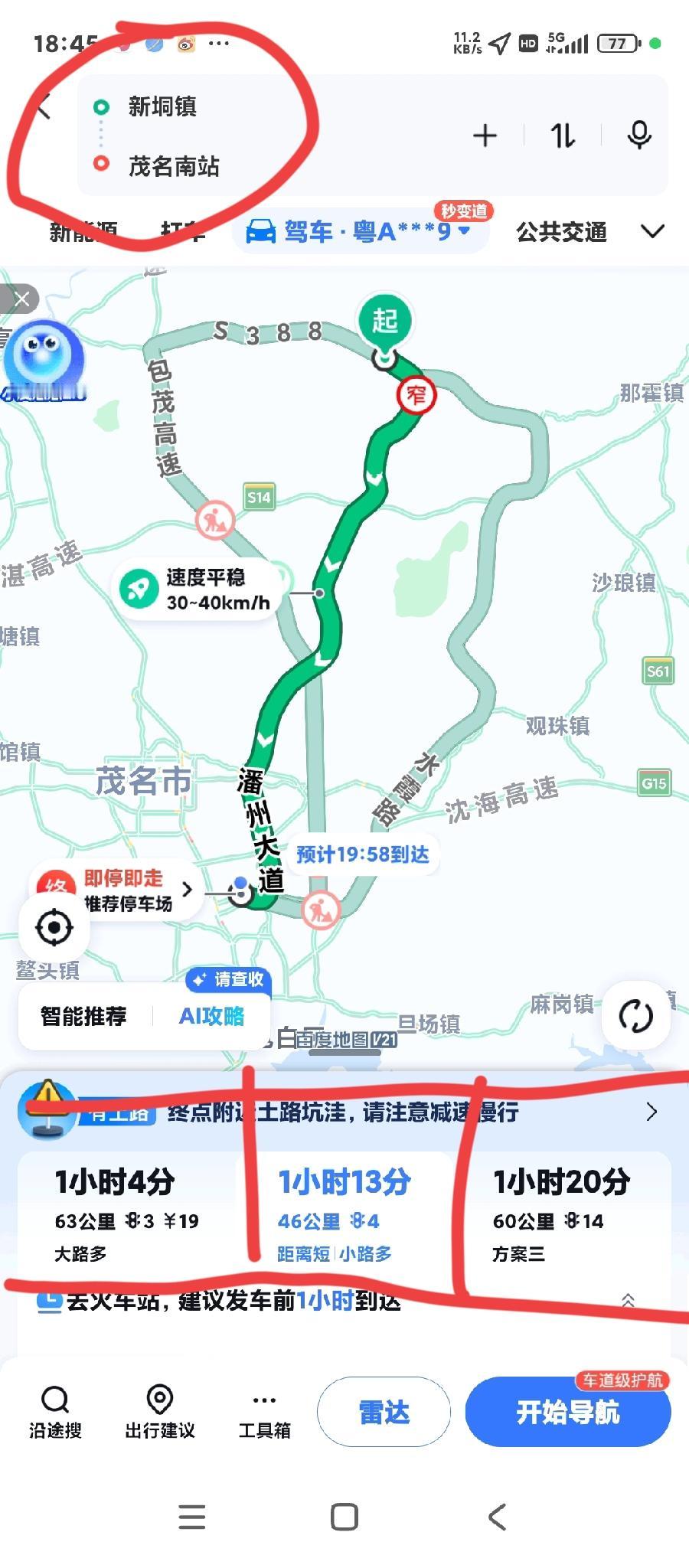 我搜索了一下,今天开通的广湛高铁马踏站与茂名南站,回我高州北部新垌镇的距离,原来我镇离两座高铁站的直线距离都不远,也才50多60公里左右,如果是家有车的,开车时间也才是1个多小时的,如果坐滴滴打车也是这时间,但如果坐中巴车就麻烦,就不是这个路程与时间了!