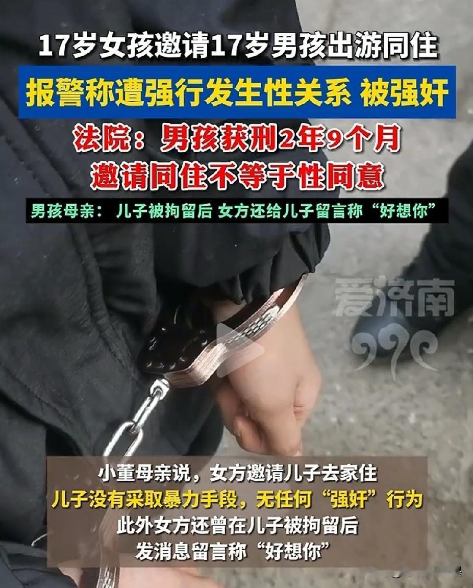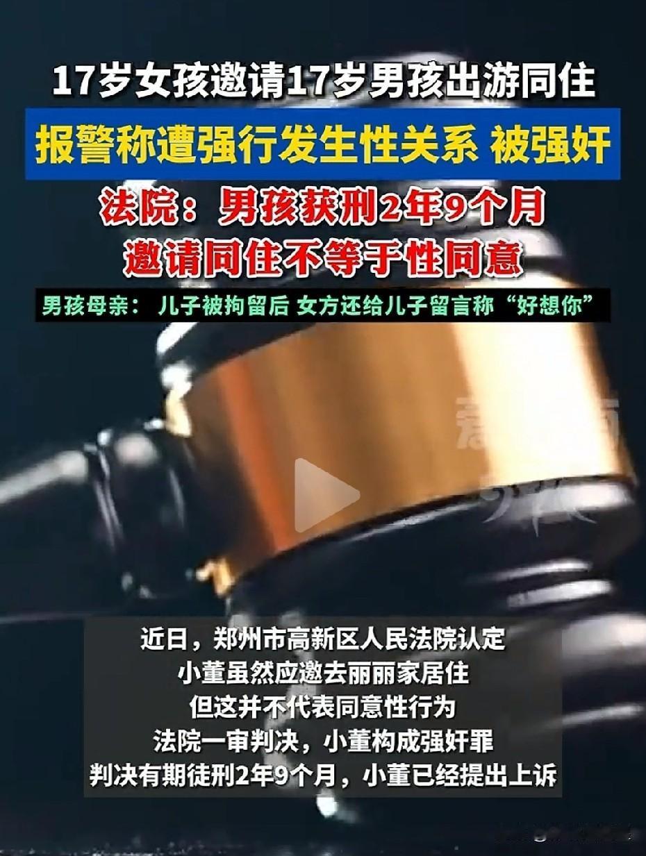 邀请男友去家里住怎么可以对女友性侵? 17岁的男孩小董与17岁的女孩丽丽确定恋爱关系,两个人在出外旅游时,丽丽邀请小董去郑州的家中居住。丽丽称她跟小董说好要分房睡,但小董却留在了自己房间,然后对她进行性侵。丽丽后报警称被强奸,法院认为邀请你去她家住不等于性同意,因此判处小董2年9个月。 而小董的母亲称,女孩邀请去她家住,儿子并没有采取暴力手段,无任何强奸行为,而且女孩还在我儿子被拘留后发信息“好想你”。 目前,小董已提出上诉。 两个孩子才17岁,还是未成年人,对爱情的认识还懵懂无知,就像两孩子玩过家家游戏。因此通过这件事也提醒家长,孩子的性爱教育非常重要,教育孩子未婚千万不要同居。 对此,大家怎么看?
