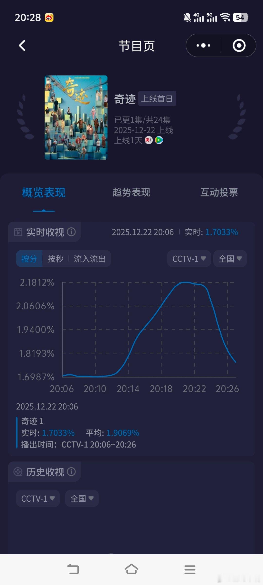 总台短剧集奇迹今日开播 《奇迹》首播收视快报!第一集起点1.7033,峰值2.18--,平均1.9069全靠央八奶第二集走势就比较一般了!