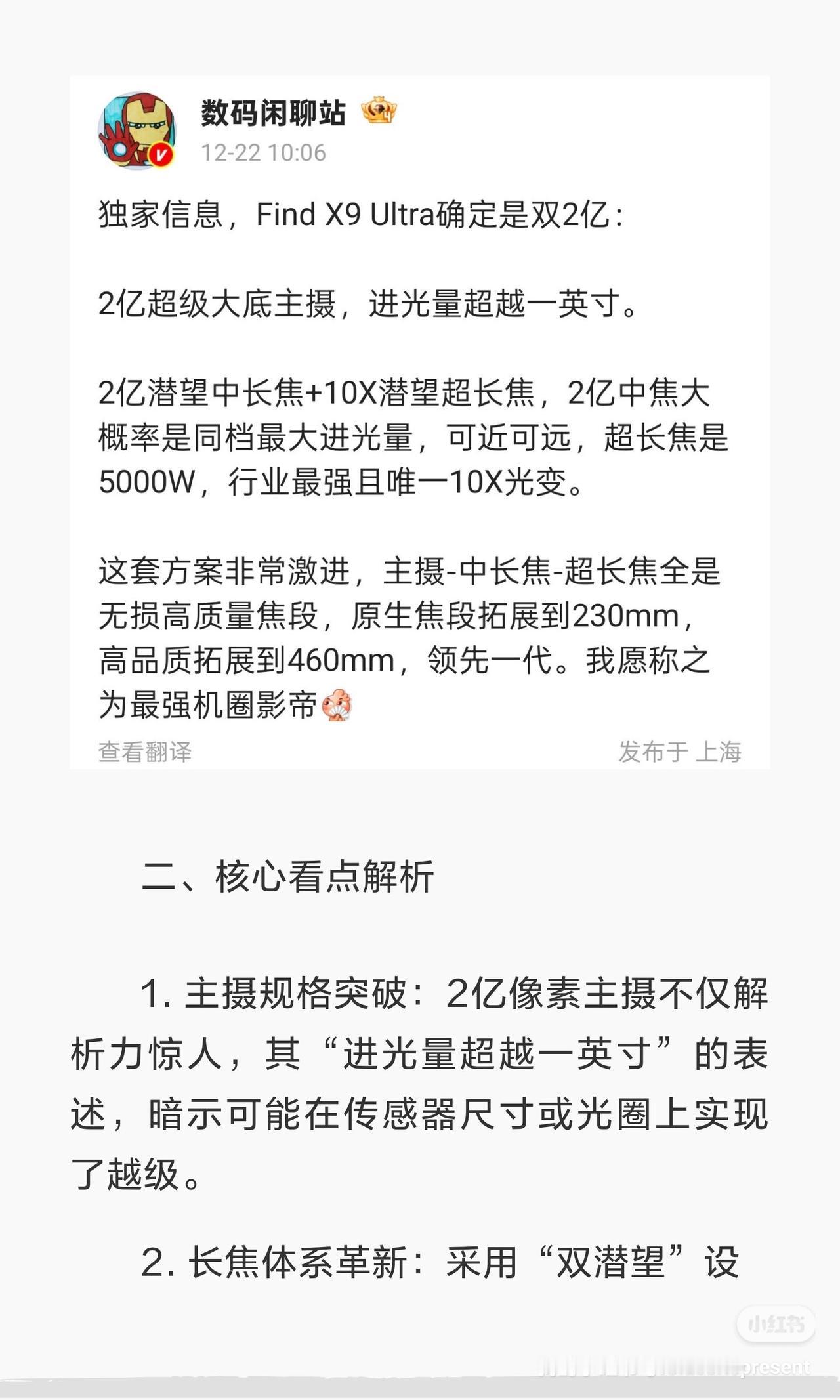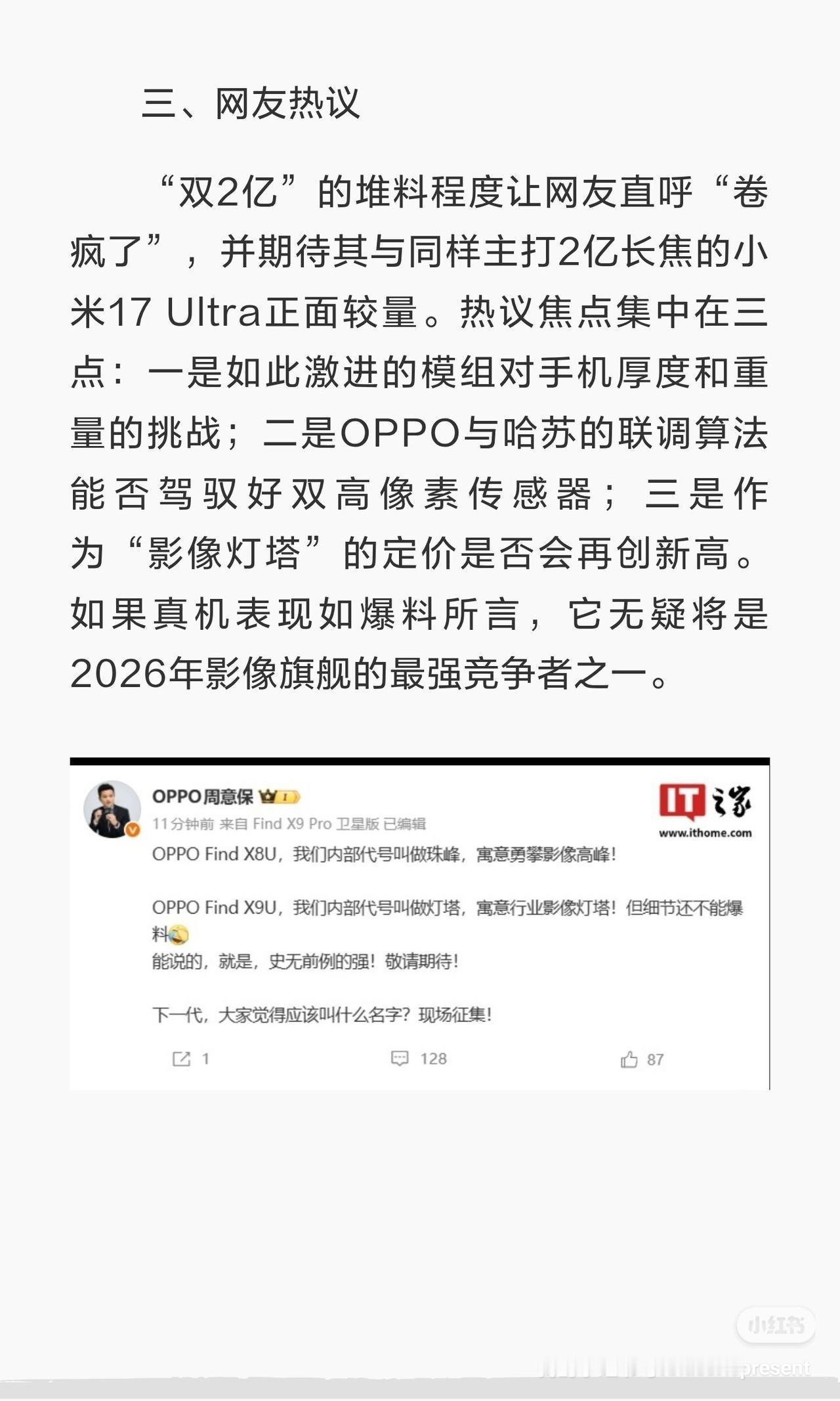 OPPO Find X9 Ultra双2亿像素,定义影像新灯塔 一、内容总结与信息增量 知名数码博主确认,OPPO Find X9 Ultra将搭载“双2亿像素”影像系统。具体包括一颗进光量超越一英寸的2亿像素超级大底主摄,以及一套2亿像素潜望中长焦+5000万像素10倍潜望超长焦的组合。OPPO Find系列产品负责人周意保同步预热,宣布新机内部代号为“灯塔”,寓意“行业影像灯塔”,并称其影像实力“史无前例的强”。这套方案实现了从主摄到超长焦的全链路高质量覆盖。 二、核心看点解析 1. 主摄规格突破:2亿像素主摄不仅解析力惊人,其“进光量超越一英寸”的表述,暗示可能在传感器尺寸或光圈上实现了越级。 2. 长焦体系革新:采用“双潜望”设计,其中2亿像素中长焦预计负责3倍左右焦段,保证中距离画质;而行业唯一原生10倍光学变焦的潜望镜,则将手机望远能力推向新高度。 3. 无缝焦段体验:官方称该配置可实现原生230mm至高品质460mm的焦段拓展,目标是在全焦段都能提供无损画质,彻底消除多摄切换的割裂感。 三、网友热议 “双2亿”的堆料程度让网友直呼“卷疯了”,并期待其与同样主打2亿长焦的小米17 Ultra正面较量。热议焦点集中在三点:一是如此激进的模组对手机厚度和重量的挑战;二是OPPO与哈苏的联调算法能否驾驭好双高像素传感器;三是作为“影像灯塔”的定价是否会再创新高。如果真机表现如爆料所言,它无疑将是2026年影像旗舰的最强竞争者之一。