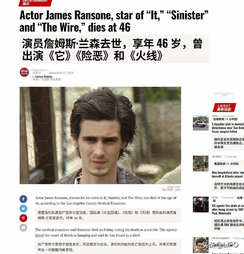洛杉矶县法医表示,根据 BNO 新闻报道,演员詹姆斯·兰索恩的死因已被裁定为悬梁