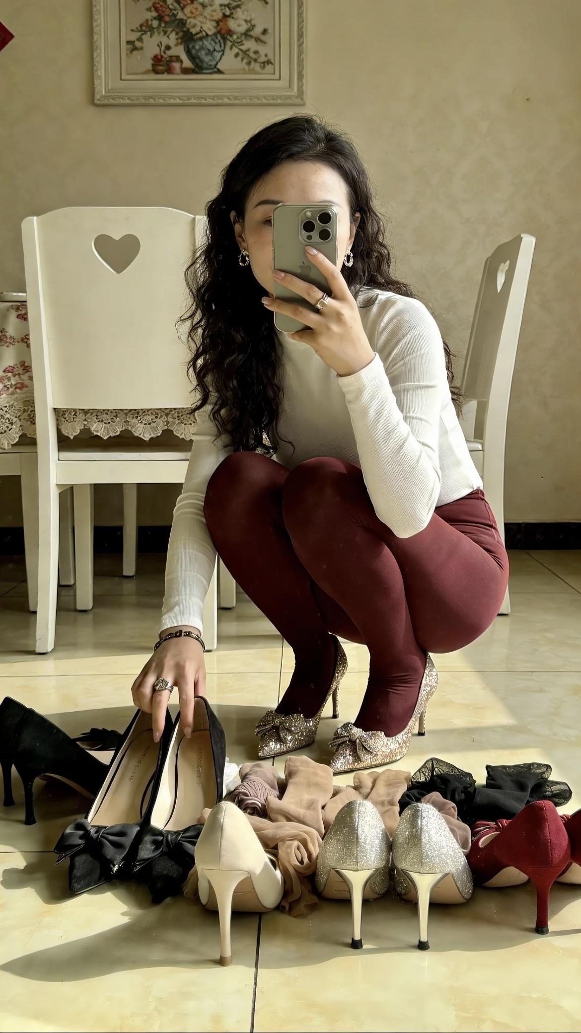 今天穿哪一双鞋和丝袜呢? 暖黄的日光淌过室内的瓷砖地面,心形镂空的白椅凝着温柔的设计感,墙面的挂画缀着花卉的雅致,为空间添了几分文艺的气息,各色的高跟鞋错落铺展在地面,鞋跟的细巧与鞋面的光泽交织出精致的美感,触碰鞋履的动作轻缓地融进这方室内的日常,持握通讯设备的姿态像是与生活的美好瞬间相拥,每一个摆弄的动作都藏着对精致日常的偏爱,平凡的室内时刻,便在这暖光的包裹中,漾出淡淡的诗意与生活独有的温柔情致。高跟丝袜穿搭