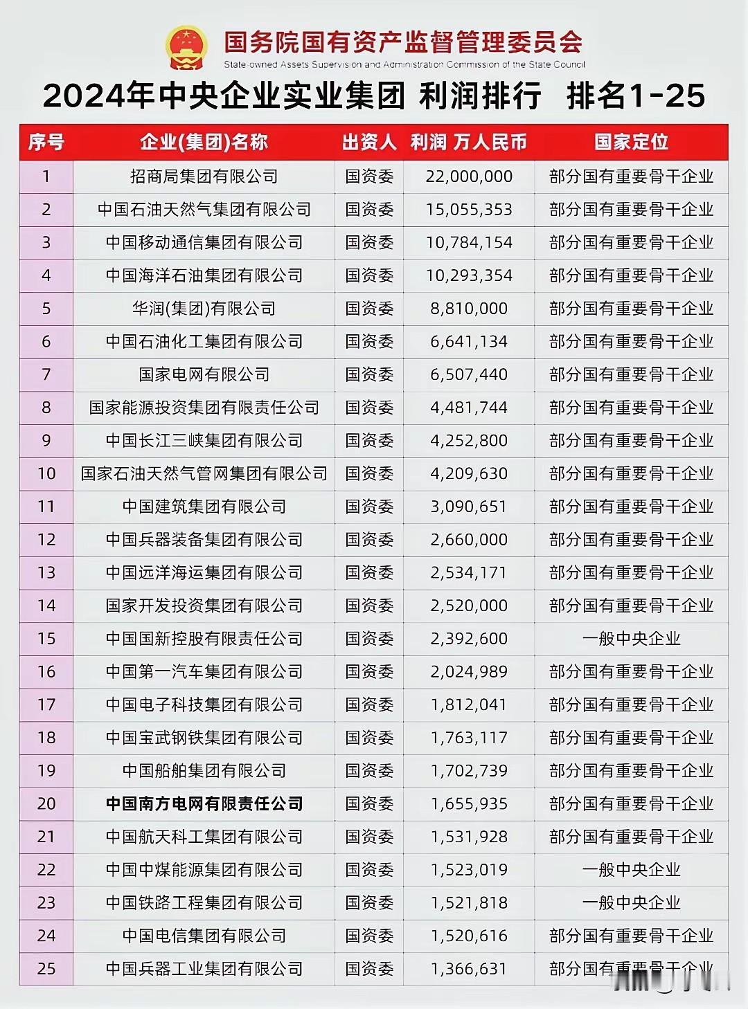 公布了!国资委公示2024年中央企业利润排行榜前25名!数据非常详细!企业经营情