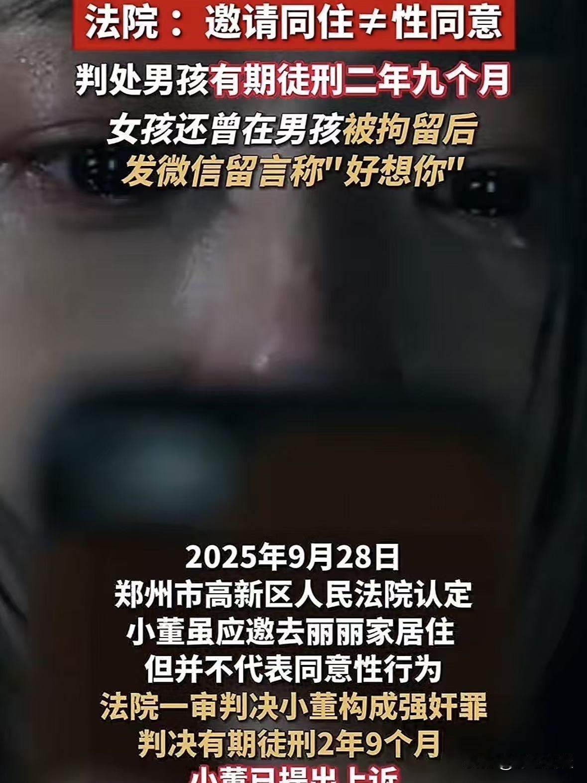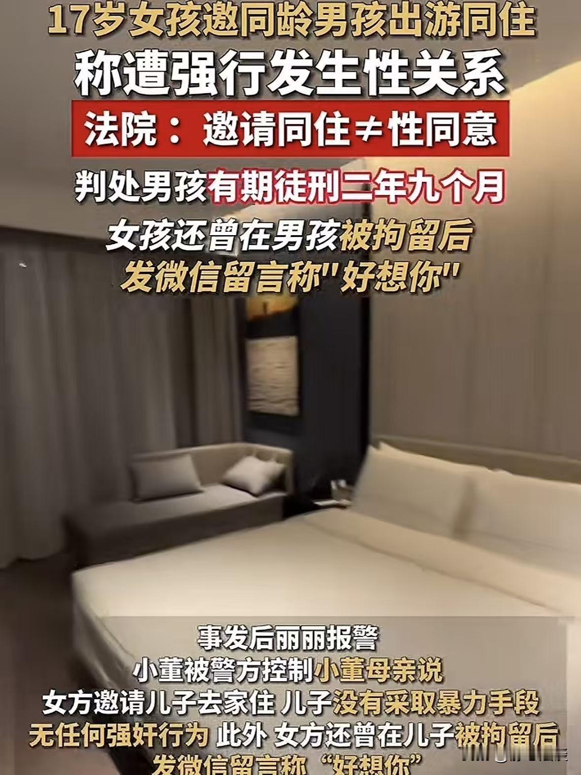 河南郑州,17岁男孩被喜欢的女生邀请出去玩,到了晚上女孩决定让男孩留在家里居住,刚好家里没人,原本两人商量好分房间睡,谁知男孩却在女孩房间迟迟不肯离开,还想要进一步发展,女孩觉得彼此年龄太小,一直拒绝,但男孩觉得女孩是不好意思,于是两人拉拉扯扯半推半就的最后还是发生了关系,万万没想到,事后女孩竟然报警说自己被侵犯,男孩母亲不干了,你邀请我儿子来你家住,对你也没有采取强制手段,这事就是你情我愿! 17岁男孩小董本以为自己遇到了真爱,没想到却让自己陷到了无尽的麻烦里。 小董17岁,正是情窦初开的年纪,他喜欢同班的女生丽丽不是一天两天了。 平时在学校里,小董总是变着法子给丽丽带早餐、占座位。 丽丽对他也有一些好感,俩人偶尔会一起聊聊天、放学顺路走一段,关系很不错。 那天丽丽主动给小董发了条消息,邀请小董周末一起出去玩。 小董看到消息的时候,激动得差点把手里的练习册都扔了。 随后翻箱倒柜地找衣服,挑来挑去选了件最干净的白T恤,还特意对着镜子梳了半天头发。 转天小董赶到相约地点,他们玩了整整一大天,开心极了。 到了晚上,已经很晚了,小董家离他们玩的地方又很远,便说要找住的酒店。 丽丽一听觉得这地离自己家不远,自己的爸妈又刚好没在家,便提议小董去他家里住,刚好有地方。 小董一听脸唰地就红了,心里又紧张又期待,嘴上却故作镇定地表示是否不太方便。 但他心里已经乐开了花,小董觉得这肯定是丽丽对自己有好感的信号。 他连连点头,嘴上说着怪麻烦的,但心里却已经开始浮想联翩。 可其实丽丽仅仅是单纯的觉得大家都是好朋友,小董出去找酒店还要花钱,自家刚好有房间,还能省点钱。 就这样两人回到丽丽家,丽丽告诉小董住那间客卧,还给他介绍洗手间在哪里。 随后丽丽便想回房间换衣服准备洗漱睡觉,谁知道一回头小董也跟了进来。 丽丽吓了一跳,问小董怎么了,小董支支吾吾的说还早,再聊一会。 可聊着聊着丽丽就觉得不对劲了,小董开始动手动脚,还一直说我喜欢你,我们在一起吧。 丽丽一边推一边喊,你放开我,我们太小了,不要这样,这样是不对的。 此时小董已经被青春期的冲动冲昏了头脑,他觉得丽丽的拒绝只是半推半就,是女孩子的矜持。 两个人拉拉扯扯的,最后还是突破了防线,发生了关系。 事情发生之后,房间里一片死寂,丽丽躺在床上,背对着小董,肩膀一抽一抽的,明显是哭了。 小董这时候也冷静下来了,看着丽丽的背影,心里突然开始发慌。 事后丽丽越想越恨,她拿小董当朋友,却没想到他竟然是那样的人,后来丽丽报了警,说自己被侵 犯。 小董很快被带回派出所问话,他整个人都傻了,他反复强调: 我们是自愿的!是她邀请我去她家的,也是她留我过夜的!我们半推半就,不是我强迫她的! 可丽丽那边却一口咬定,自己从头到尾都在拒绝,是小董强行和自己发生了关系。 小董的妈妈得知此事后,难以接受,明明是女孩主动邀请自己的儿子出去玩,还邀请对方到自己的家里去。 要是不愿意,她能这么做吗?何况自己的儿子根本没对她用强制手段,就是俩孩子情窦初开,你情我愿的事! 而且小董母亲还说,事后丽丽还给自己儿子发过信息说:“我想你了”这种话。 如果丽丽对他没有感情,怎么会平白无故邀请男生去自己的家里。 17岁的年纪应该知道让两个互相爱慕的孤男寡女共处一室,会发生什么。 处于青春懵懂年纪的人两个发生这种事,不能仅凭女方的一面之词,那对男方太不公平了。 《刑法》第236条:以暴力、胁迫或者其他手段强奸妇女的,处三年以上十年以下有期徒刑。 这核心是违背妇女意志,以暴力、胁迫或其他手段强行与妇女发生关系的行为。 最后,判决小董犯强 奸 罪,判处有期徒刑2年9个月。 小董及家人不服提起上诉,小董母亲认为儿子如果承担所有责任,那他今后的生活就全毁了。 现在,案件还在进一步调查中,而小董和丽丽这两个原本应该在校园里无忧无虑的少年。 却因为这一场糊涂的约会,彻底改变了人生轨迹。 有人说,小董太冲动,分不清半推半就和自愿的区别。 也有人说,丽丽太单纯,不该随便留异性在家过夜,给了对方错误的暗示。 可不管怎么说,这件事都给所有青春期的孩子和家长敲响了警钟。 青春期的感情是美好的,但也是脆弱的,更是需要边界感的。 尤其是对于未成年人来说,身体和心智都还没发育成熟,有些事一旦做错了,就再也没有回头路了。 一场本该是青春里的小美好,最后却演变成了一场悲剧,这其中的教训,值得所有人深思。 对此,您怎么看呢?欢迎评论留言! @静心法谈 学法辨是非,慬法不吃亏。