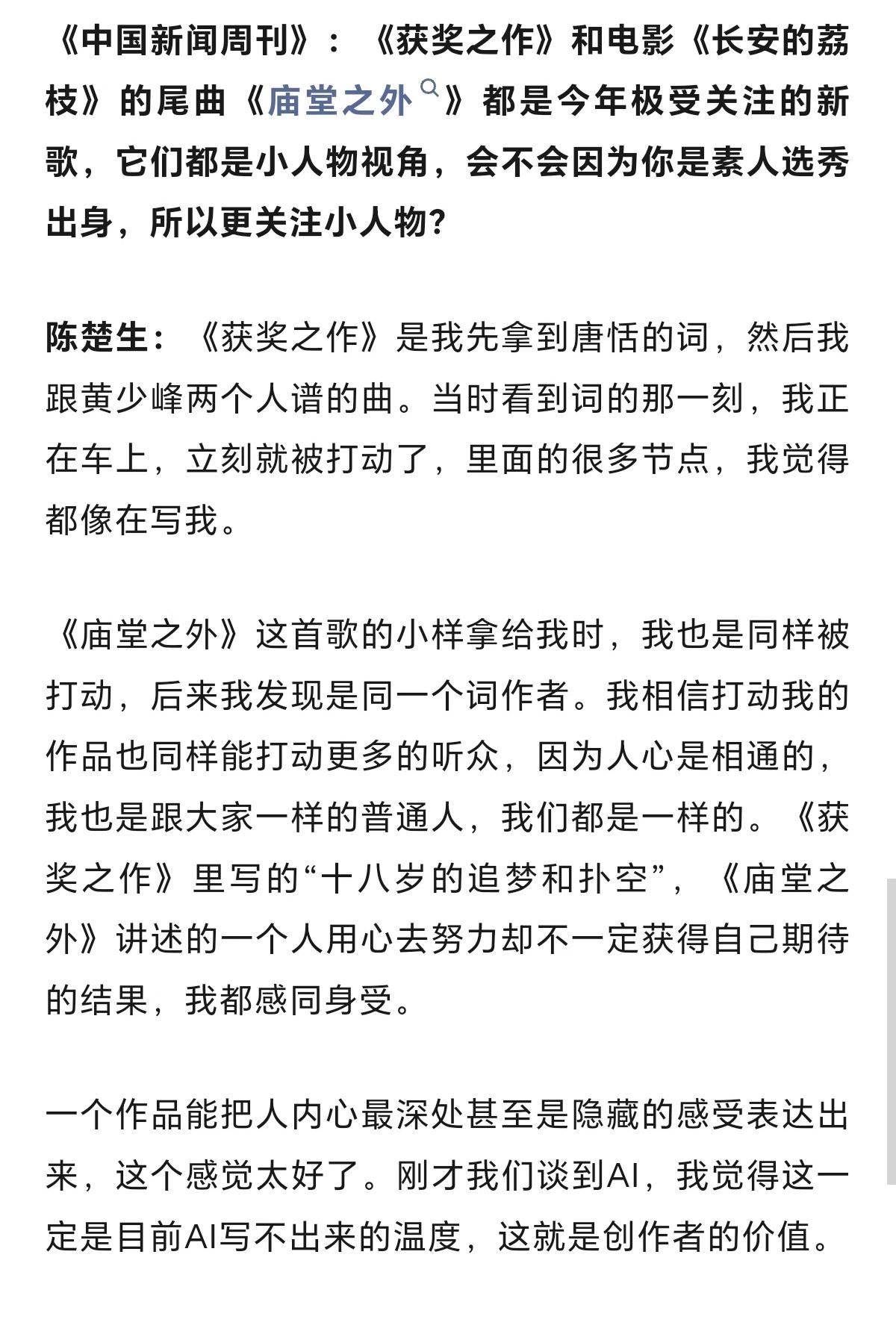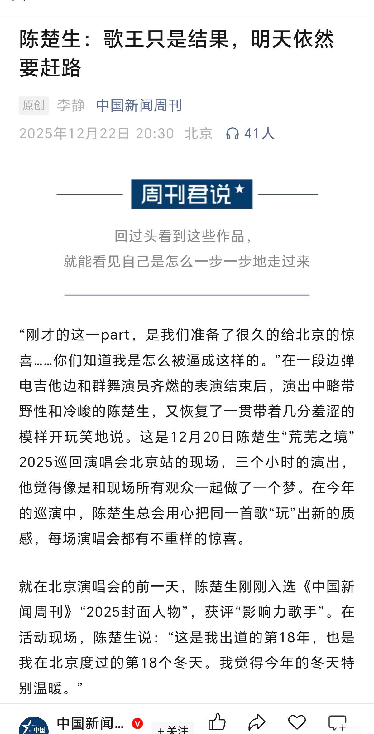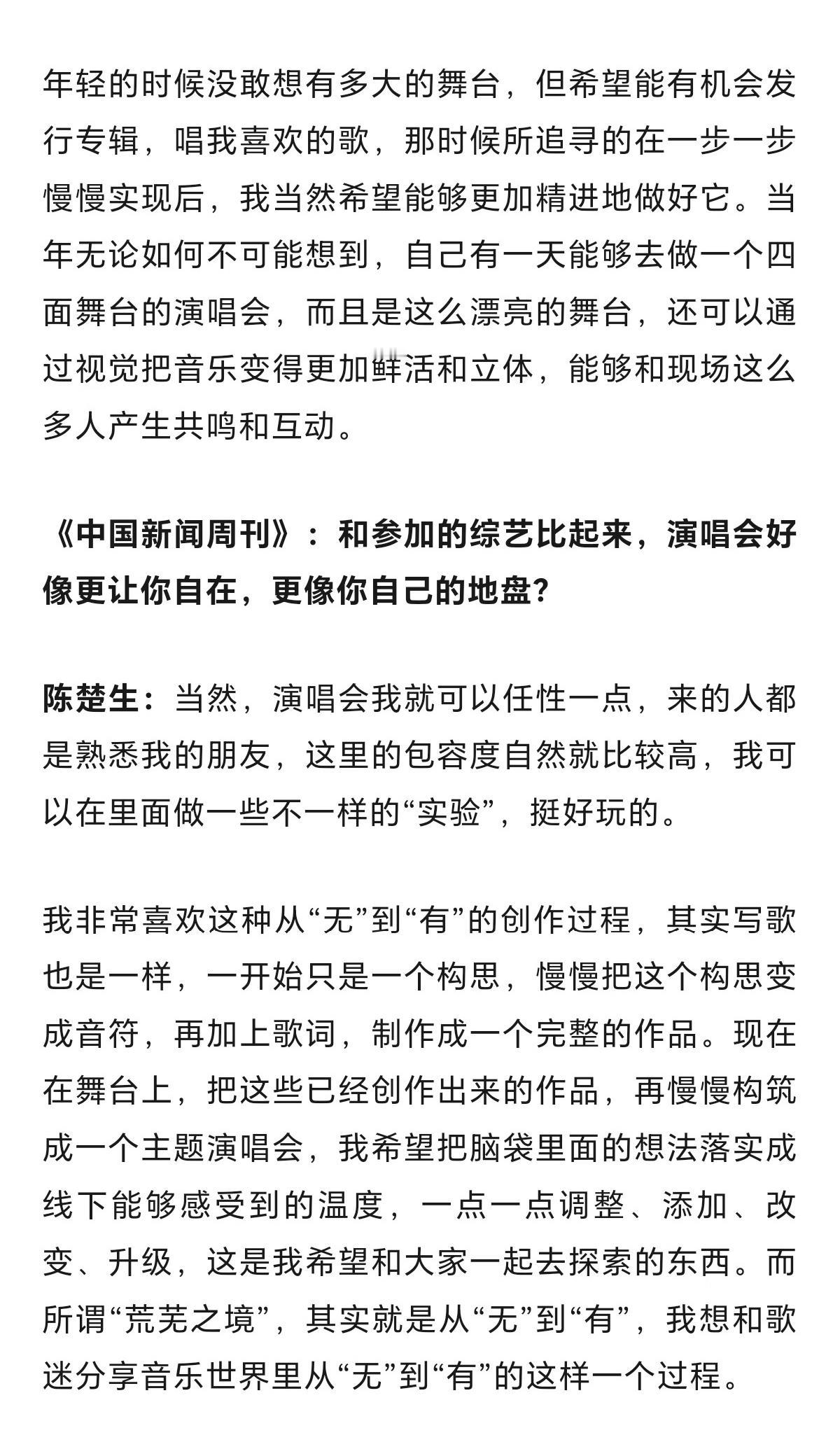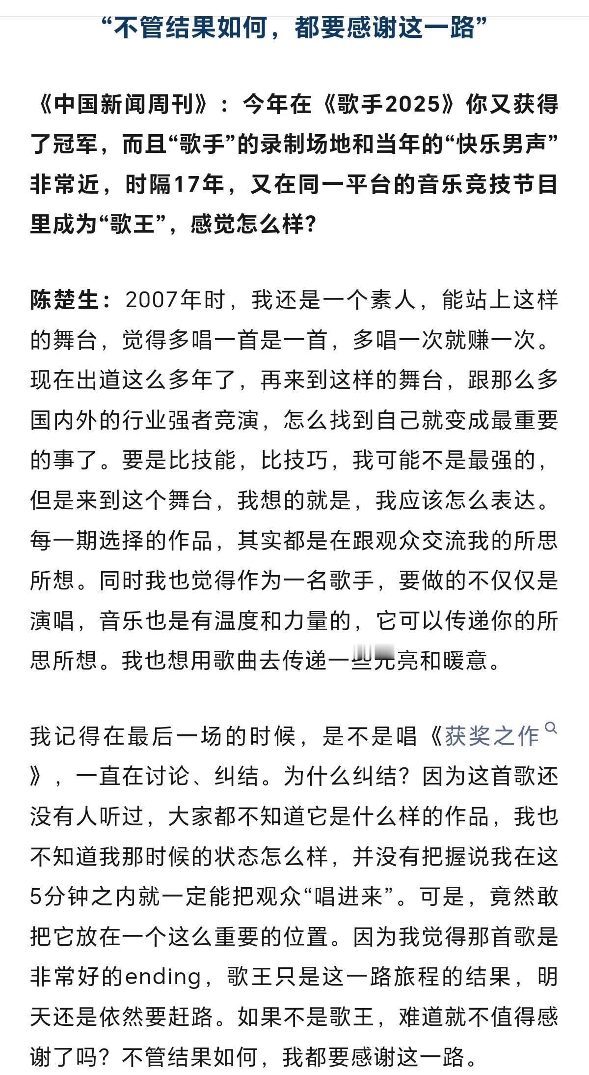 中国新闻周刊陈楚生的采访来了! 歌王只是结果,明天依然要赶路。 这就是陈楚生,他一直都在前行,没有任何懈怠和抱怨,每一步都算数! 看了他的采访,心里对他更是喜欢和敬重。 优秀的人在哪都会发光,都会引领着身边的人。 他就是用他的歌声和他对音乐的热爱影响着喜欢他歌声的每一个人。