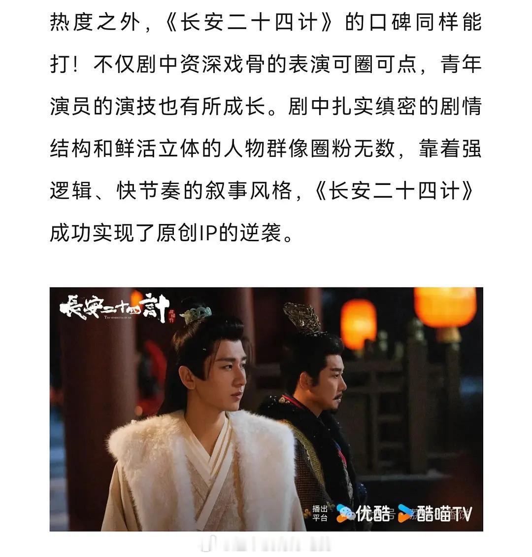 优酷认证成毅《长安二十四计》:当之无愧的年度黑马口碑爆剧!首播当日收视率即突破2%,创央8次黄档年度最高!稳坐优酷悬疑剧、古装剧、传奇剧三榜榜首!👏