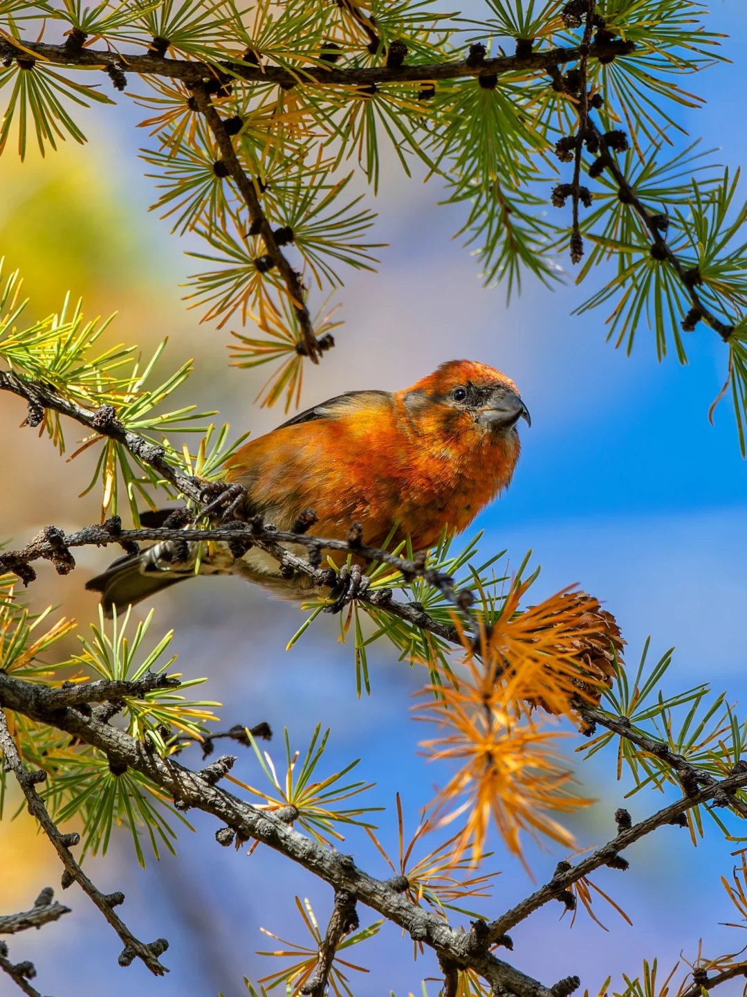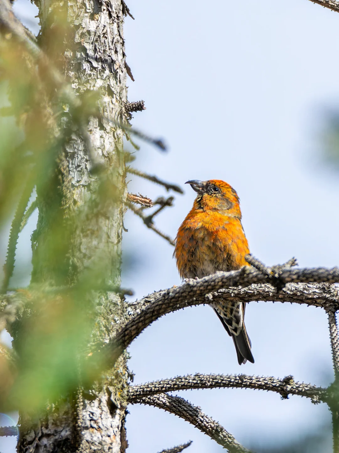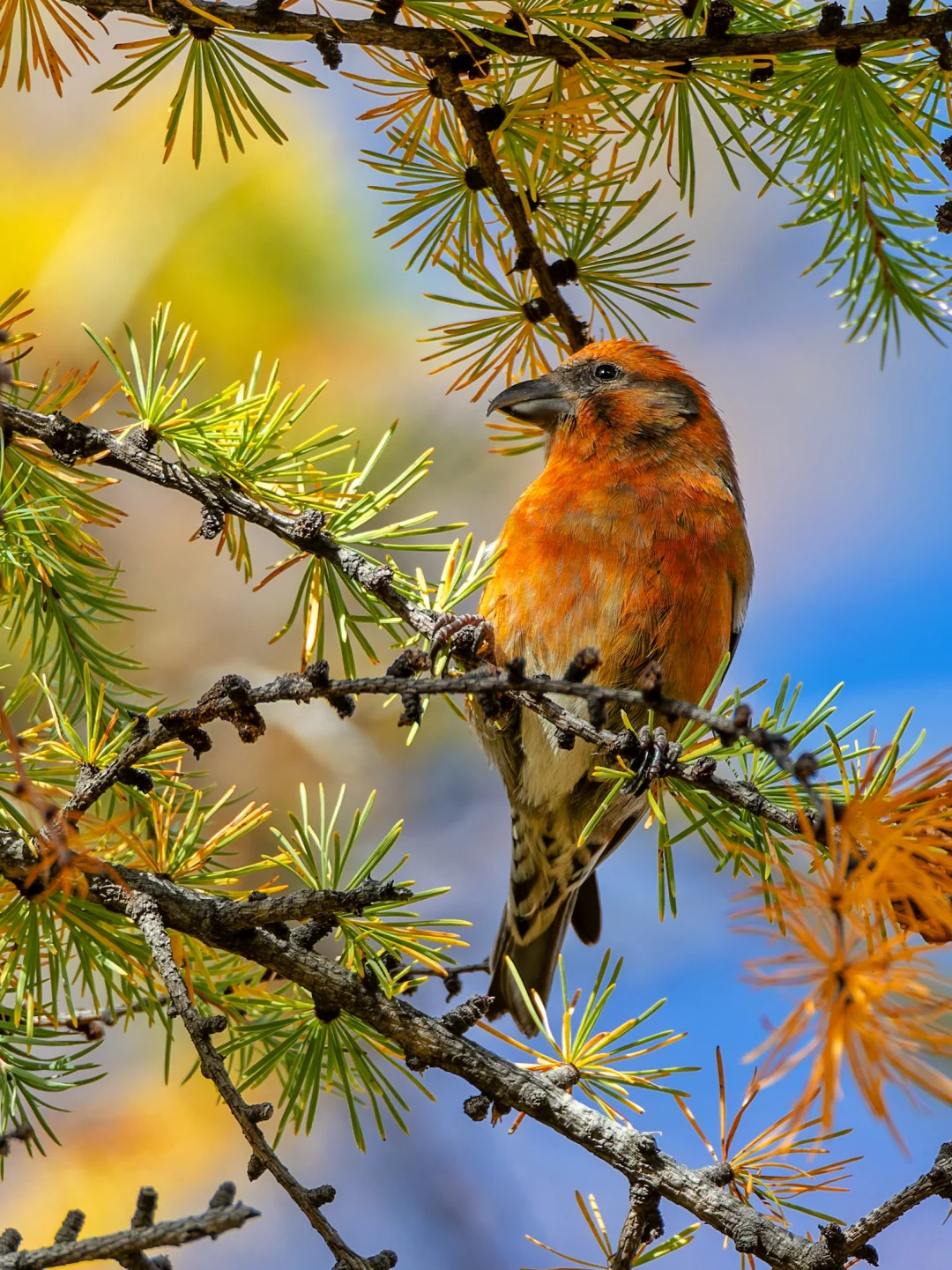 原创拍摄 红交嘴雀,Red Crossbill,雀形目燕雀科交嘴雀属。是分布广泛,在我国最容易见到的交嘴雀,在东北地区还有繁殖记录。我国国家二级保护动物。 红交嘴雀雄鸟红色或橙色,雌鸟淡黄色。交嘴雀有一个独特特征是上下嘴喙弯曲,在尖端相交,这是它们为了能够高效地从球果中获取种子而独特进化的结果,实在是有趣。