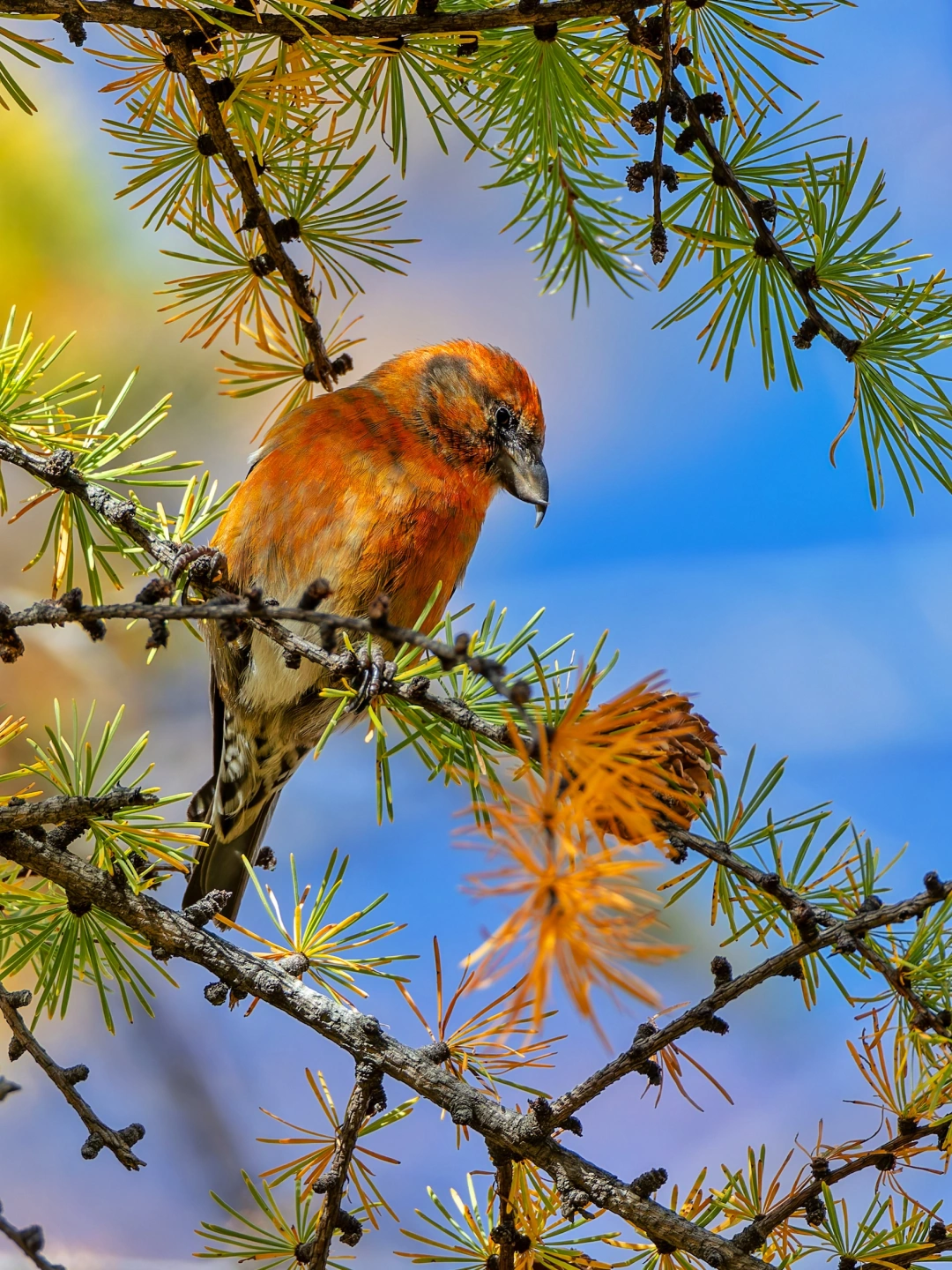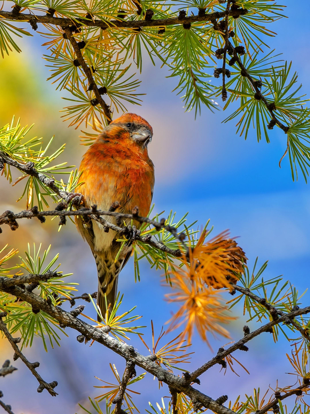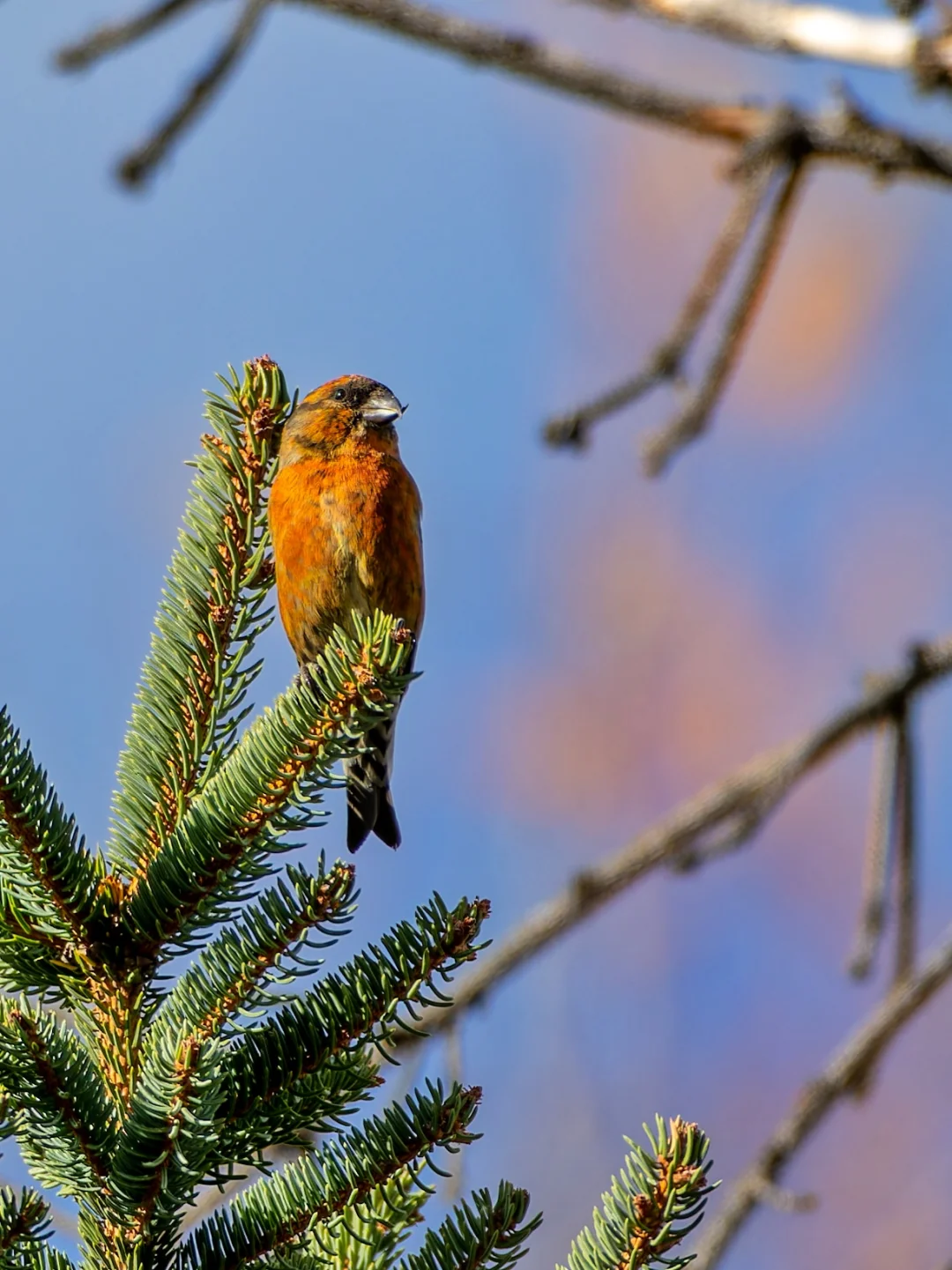 原创拍摄 红交嘴雀,Red Crossbill,雀形目燕雀科交嘴雀属。是分布广泛,在我国最容易见到的交嘴雀,在东北地区还有繁殖记录。我国国家二级保护动物。 红交嘴雀雄鸟红色或橙色,雌鸟淡黄色。交嘴雀有一个独特特征是上下嘴喙弯曲,在尖端相交,这是它们为了能够高效地从球果中获取种子而独特进化的结果,实在是有趣。