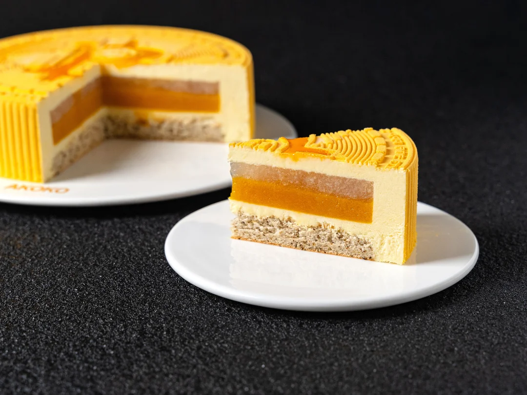 清水、芒果果茸和百香果果茸混合加热至 40°C,倒入提前拌匀的NH果胶和砂糖,快速搅拌加热煮沸离火,倒入保鲜膜封底的6寸圈模中约至1.2cm厚度后冷冻冻硬。