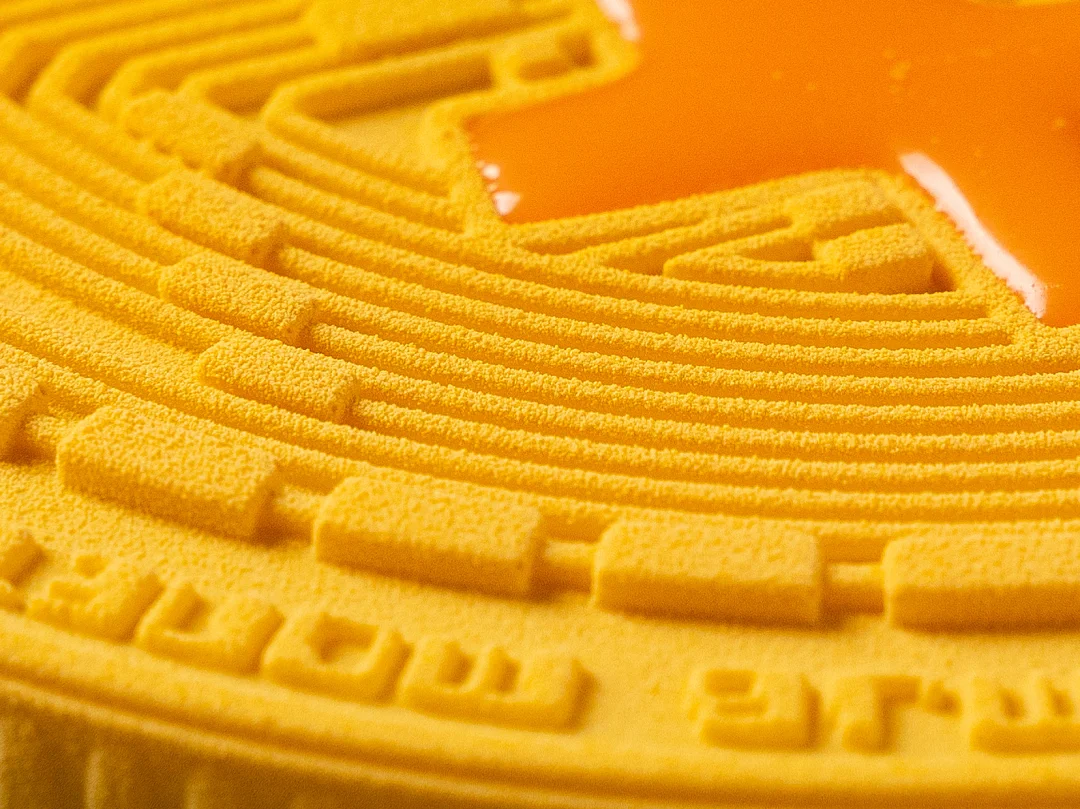 2、脱模后置于转盘上,整体均匀喷涂黄色喷砂液,温度为35-40°C。所需材料:100克喷砂液,2克油溶白色色粉,0.9克黄色,0.05克红色。