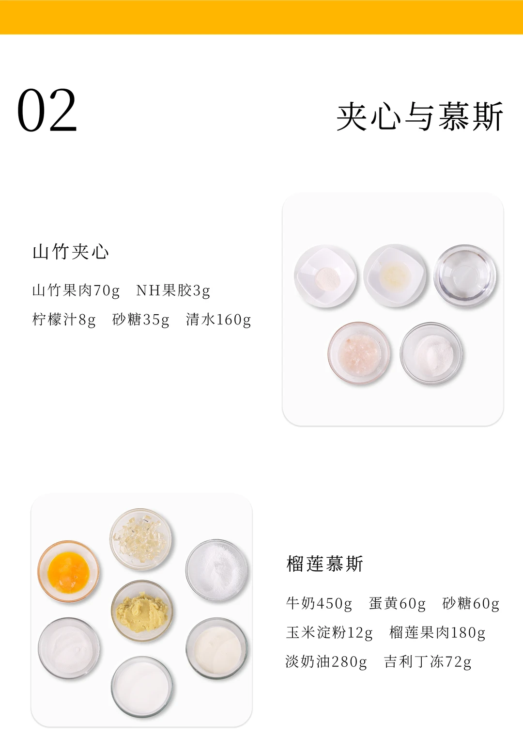 清水、山竹果肉和柠檬汁混合加热至40°C,加入提前拌匀的NH果胶和砂糖,快速搅拌加热煮至沸腾离火,倒在冻硬的芒果啫喱上约1cm厚度后冷冻冻硬。