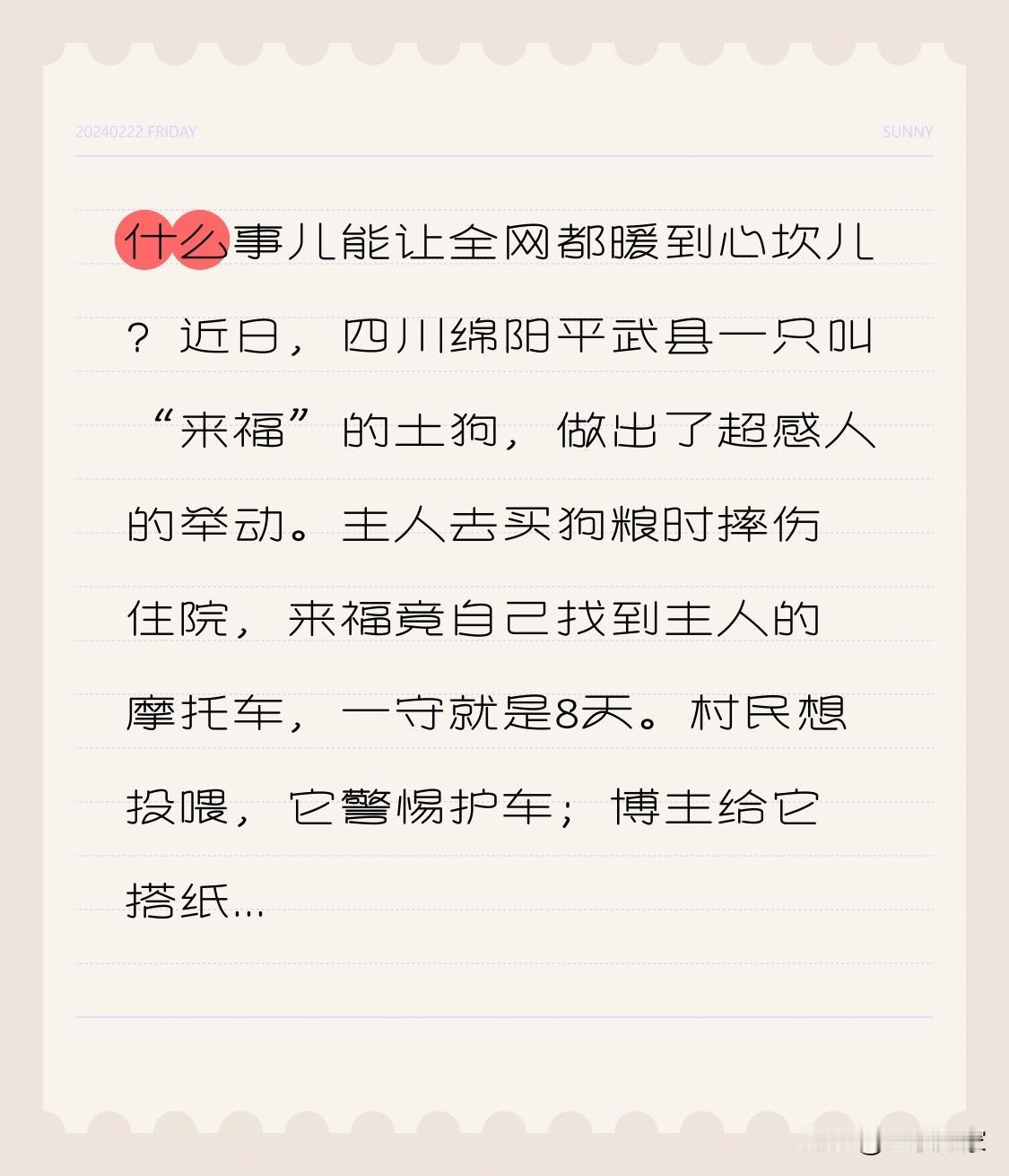 什么事儿能让全网都暖到心坎儿?近日,四川绵阳平武县一只叫“来福”的土狗,做出了超感人的举动。主人去买狗粮时摔伤住院,来福竟自己找到主人的摩托车,一守就是8天。村民想投喂,它警惕护车;博主给它搭纸箱保暖,还拍视频发上网。视频传开,大家都被它的执着打动。主人忍伤提前出院,第一时间来接它回家。 这一幕像极了“忠犬八公”,双向奔赴的情感太戳人。你家宠物做过哪些让你感动的事?动物的忠诚能有多令人震撼?你如何看待人与宠物间的情感纽带? 来福猎犬 藏獒来福 金毛犬来福 来福家萌宠 成都来福 重庆狗狗救助 荣昌小狗 藏獒来福 金毛犬来福 来福家萌宠 成都来福 荣昌小狗 重庆狗狗救助 柴犬女明星来福