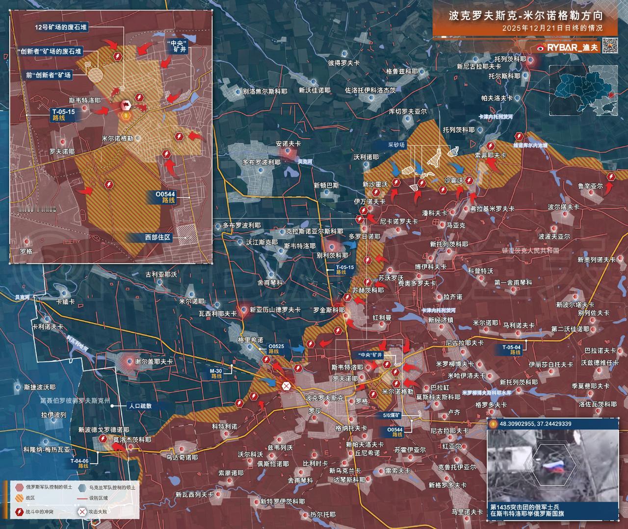 🚩波克罗夫斯克-米尔诺格勒方向的战况 2025年12月21日日终的情况 俄军对米尔诺格勒地区的乌克兰驻军的包围圈正在收紧。俄军已占领该城西部大部分地区,目前正从此方向向该市推进。 俄罗斯联邦武装力量第1435突击团的部队已清理斯韦特洛耶村的一条中心街道,并在此升起了俄罗斯国旗。俄军先头突击小队继续向该地区东面进攻,目标是夺取该地区的“中央”矿井附近的坚固建筑,以与该区域的俄军部队会合。 与此同时,俄军部队正向第12号矿场的废石堆区域推进,占领此处将使俄军能对周围的私人建筑区建立起火力控制。敌方步兵大多未进行有组织的抵抗,而是选择藏匿于地下室中。 🔸与此同时,在该战场东北方向,前“创新者”矿场区域的战斗仍在继续。清理该设施的行动因敌方大量无人机在空中活动而变得复杂,这些无人机通过部署在矿厂废石堆上的信号中继器从而保持通讯。 📌俄军无人机操作员正在逐步摧毁相关基础设施,为即将对乌军在该地区内,对俄军防御阵地发起的强攻而进行“削弱乌军攻势”的准备。 俄乌冲突新局势俄军最新进展热点观点 来源:RYBAR_渔夫