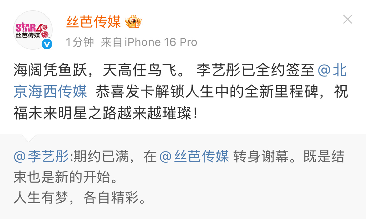 哇塞 李艺彤离开丝芭了李艺彤合约期满离开丝芭李艺彤离开丝芭传媒