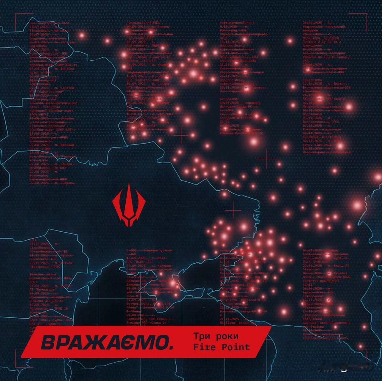 乌克兰火力点公司发布地图,详细展示三年来乌军使用该公司武器对俄罗斯目标实施的所有打击行动。该公司生产 FP-1 和 FP-2 攻击无人机,以及 FP-5"火烈鸟"巡航导弹等设备。
