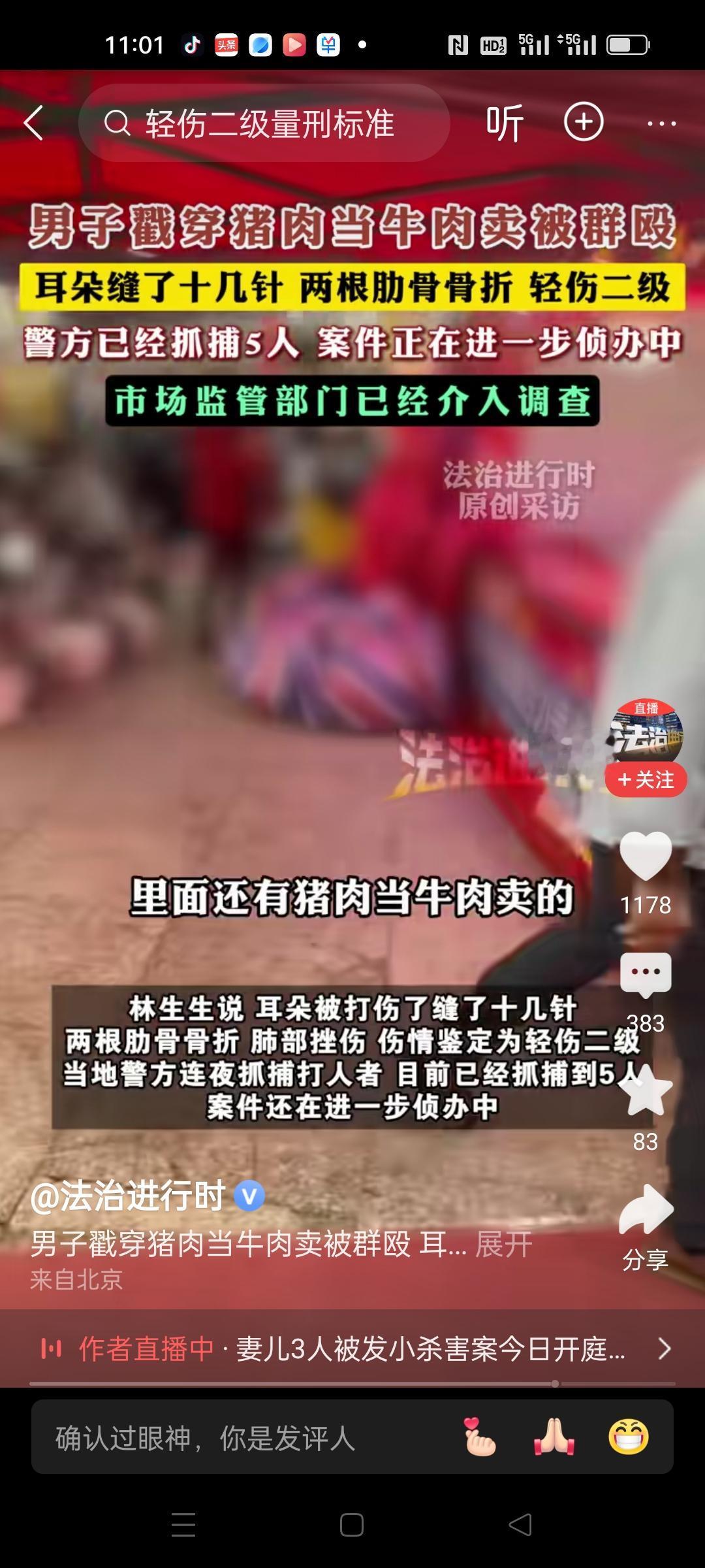 太猖狂了,猪肉当牛肉卖被顾客戳穿,老板找了5个人围殴客人,打断二根肋骨,耳朵缝了十几针。 警方给力,当天晚上就抓了三,四个。第二天顾客做法医鉴定,属于轻伤。 这几个动手的人和背后指使的人都不能放过,该判就判。 为了赚钱坑蒙拐骗不说,还这么凶恶,必须要受到制裁!