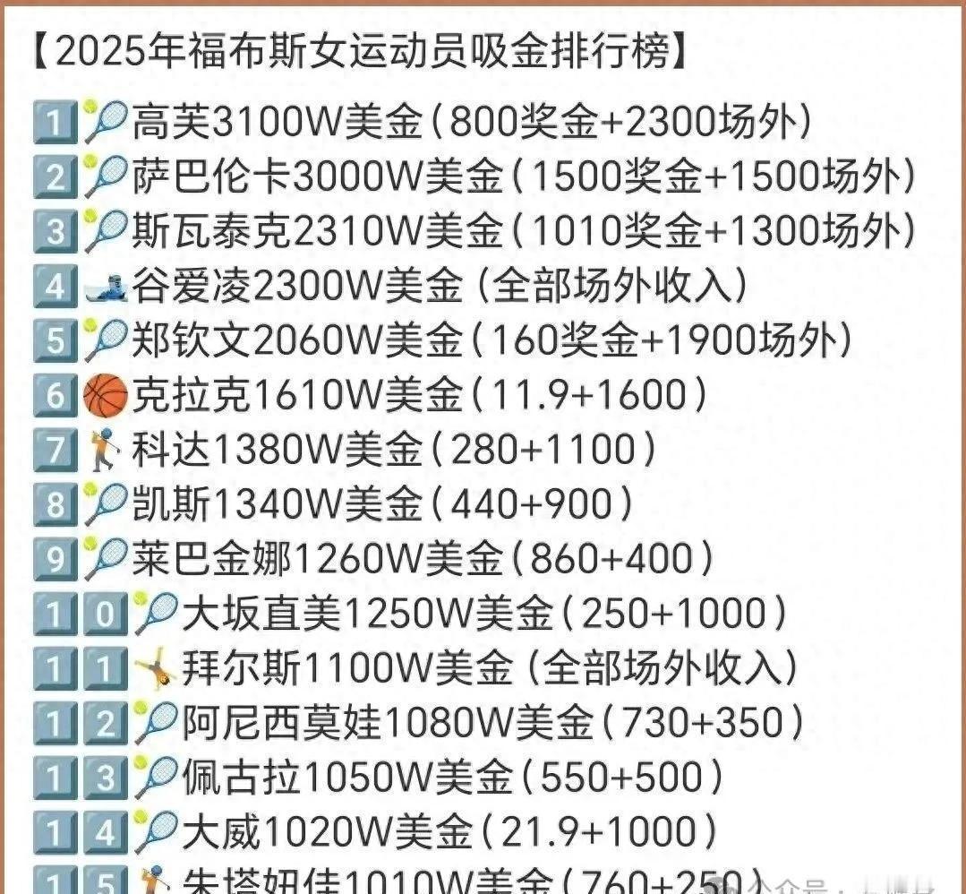她越不比赛,广告商越疯狂。 全球运动员收入榜第四,她靠的不是滑雪。 郑钦文手握球拍在WTA拼杀,谷爱凌在社交媒体发条动态,价值百万美元。2023年,她的代言名单又添上顶级奢侈牌和科技巨头。 你以为是冬奥冠军的光环? 错了。 冬奥结束那刻,才是她商业帝国的真正起点。 她撕掉了“赛季运动员”的标签。 传统逻辑是比赛曝光,停赛降温。 她的逻辑是:用赛场金牌做信用背书,用场外人生做无限舞台。 横跨中美,不是选择,是战略。 高情商话术,不是天赋,是武器。 选择代表中国参赛,是她撬动地球的杠杆。 这步棋,看懂了十四亿人的市场,也看懂了一个时代的情绪。 品牌买的不是她的滑雪板,是她身后汹涌的流量和清晰的人设。 当其他运动员在争排名,她在重新定义规则。 收入数字只是表象,底层是她对个人品牌绝对精准的操盘:把“谷爱凌”三个字,经营成一家没有淡季的上市公司。 她证明的不是赛道多宽,而是跑者多强。 商业世界的新逻辑,正在被这个22岁的女孩亲手写下。