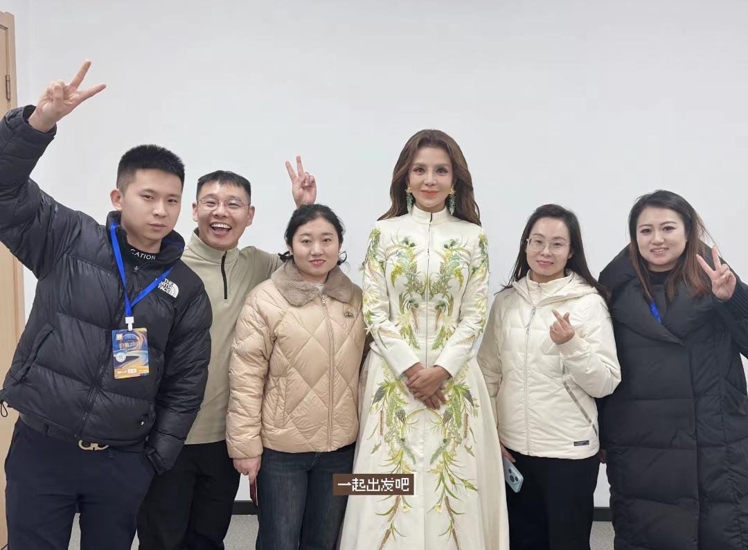 朱迅现身山西,来这里主持节目了,上台主持的造型很美,还是那么会穿衣服。 朱迅穿的主持服是一件白色长裙拖地礼服,上面印有绿色花纹,看起来大气,戴着浅绿色吊坠,光彩照人,被染色的头发很长。 身边的工作人员和朱迅老师合影了,朱迅高挑。