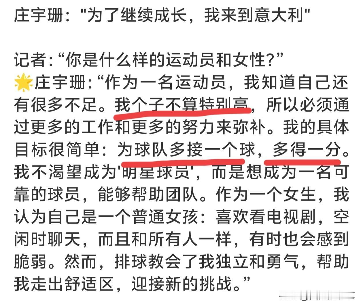 庄宇珊很真实,一起看看意甲打球的庄宇珊对自己的评价和要求[呲牙] 她承认身高不占优势,所以她要求自己勤奋工作,场上多接球,多得分。瞧,在前排,她瞅准时机,努力向上跳得很高,形成威慑对手的一堵墙。同时,她又做好进攻线路分化,力争扣球速度很快,形成突破得分。在后排,她变成接一传的好手,为二传做好精准地输送。 庄宇珊,就是这种低调、勤奋、能干、积极向上,永不满足的运动员,一起为她加油点赞👍土楼姑娘庄宇珊 庄羽珊意甲首秀 庄雨姗 排球运动员身高