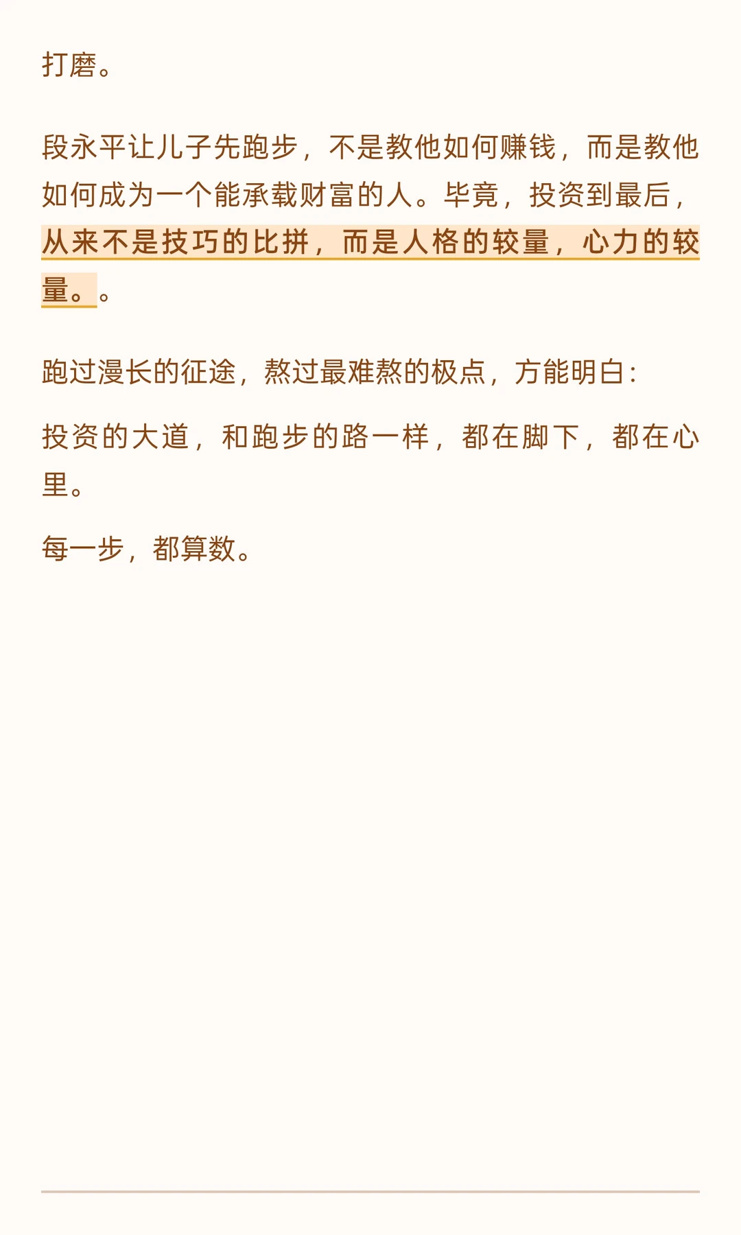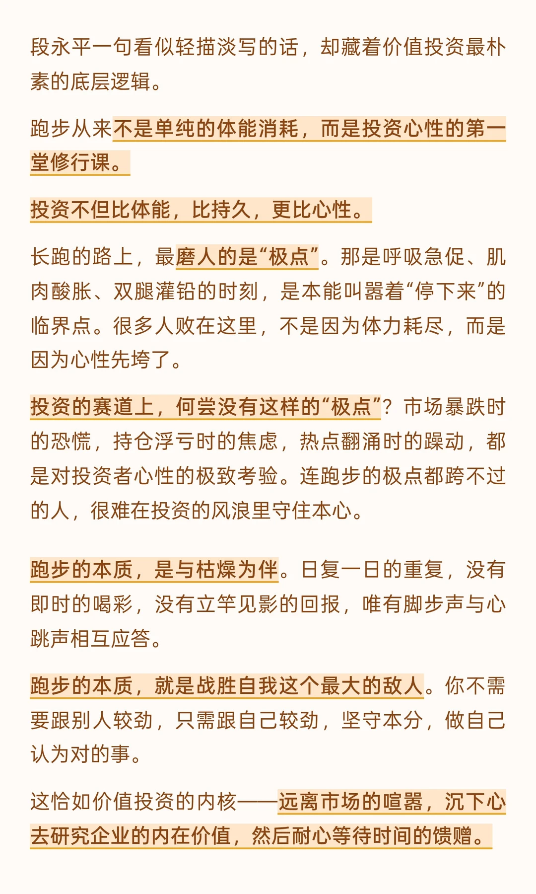 段永平在被问及是否教儿子投资、是否开了投资账户时,给出了这样的回答:“呵呵,账户早就开了,就看他什么时候真的有兴趣。我不强迫他。呵呵,我教儿子投资的第一件事是每天要去跑步。” 面对网友对“跑步与投资关联”的共鸣,他进一步补充点睛:“呵呵,我跟你想的差不多。如果一个人连跑步的‘极点’都过不去,别的挑战就有点难了。” 段永平一句看似轻描淡写的话,却藏着价值投资最朴素的底层逻辑。 跑步从来不是单纯的体能消耗,而是投资心性的第一堂修行课。 投资不但比体能,比持久,更比心性。 长跑的路上,最磨人的是“极点”。那是呼吸急促、肌肉酸胀、双腿灌铅的时刻,是本能叫嚣着“停下来”的临界点。很多人败在这里,不是因为体力耗尽,而是因为心性先垮了。 投资的赛道上,何尝没有这样的“极点”?市场暴跌时的恐慌,持仓浮亏时的焦虑,热点翻涌时的躁动,都是对投资者心性的极致考验。连跑步的极点都跨不过的人,很难在投资的风浪里守住本心。