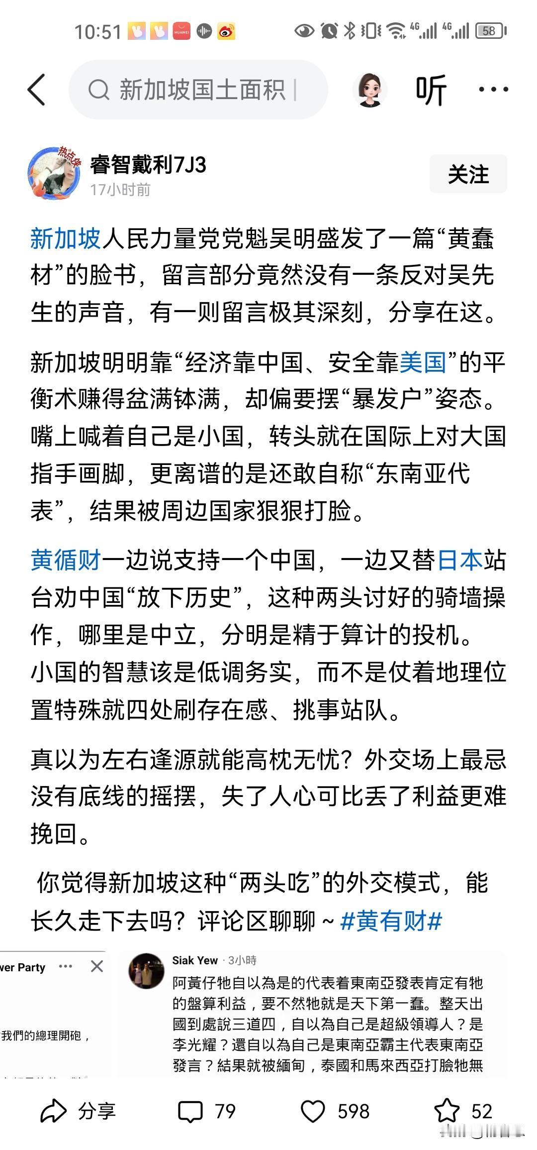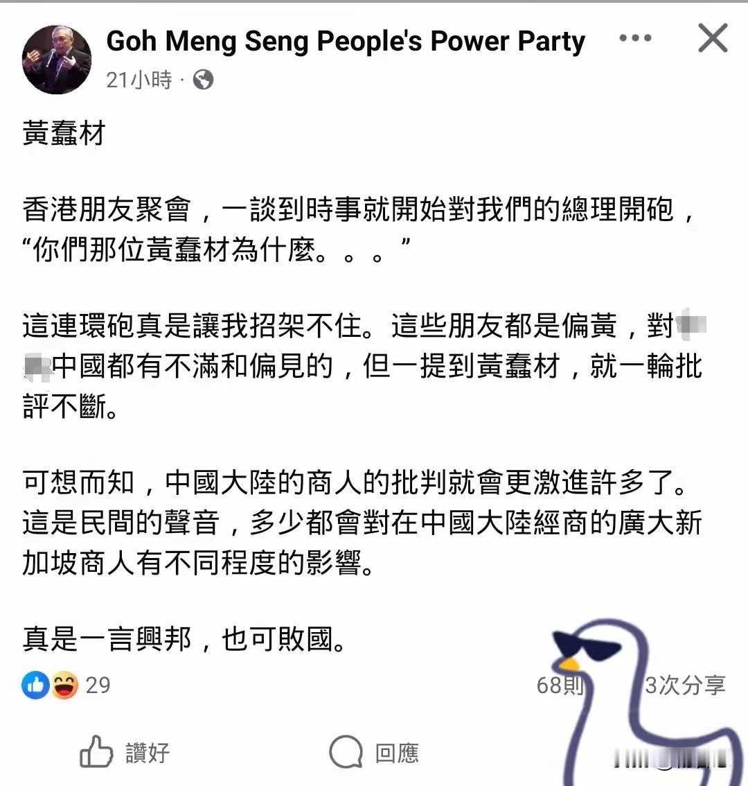 新加坡总理黄循财在粤语中就是黄蠢才的发音。所以香港那边的商人直接叫他黄蠢才。新加坡领导人的心态是矛盾的,也是畸形的,一方面张口闭口说自己是小国,一方面,又总是以一小国指点国际指点中国,这他们心里不是一点没摆正吗?黄蠢才都说小国没有议价权,既然知道了,就要摆正好心态,坐好自己的分内事是吧?你保持中立,都可以过得很好了。何必去趟浑水呢?除非他们心里见不得中国好。