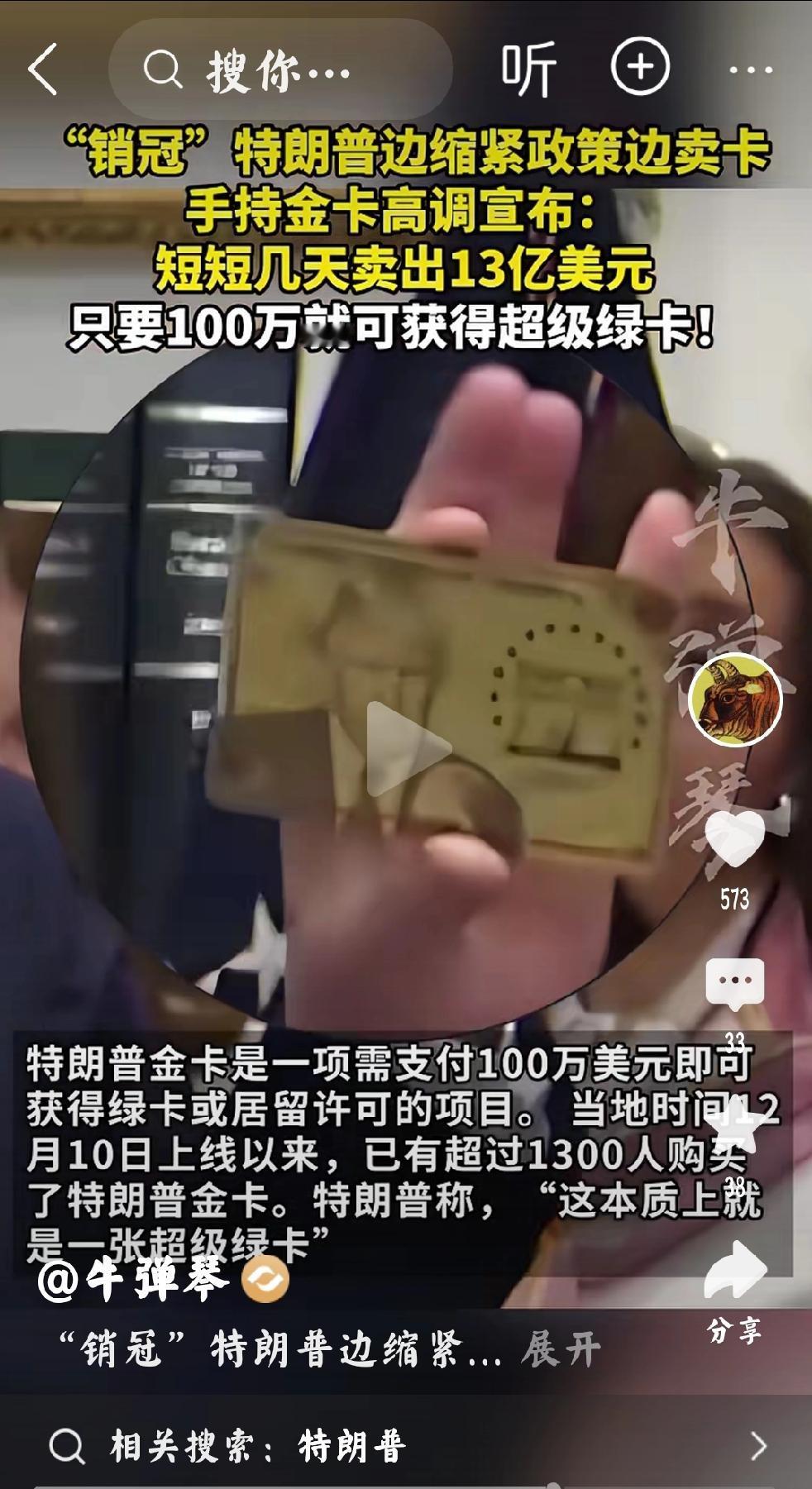特朗普的财技目的? 个人观点:首先介绍几点新闻:1,截止2025年财政年度,美国的债务总额已经超过37.6万亿美元,比上一年又增加了2.2万亿美元 2,2025年增加的债务已经超过美国一年创造的财富,这说明美国一年赚的钱连还债务都不够。 3,更加致命的是:“美国每年要付的债务利息接近1万亿美元,并且这已经成为政府的第二大开支。 4,美债持有者,大多数是美国国内机构和美国民众。 5,国际评级机构穆迪已经把美债的信用等级从最高的3A级下调到a1级,这说明美债的安全性已经大幅度降低,并且随时可能爆发债务违约。 在这种情况下,观看特朗普的个人财技新闻,第一感觉是这对美国债务危机来说是杯水车薪。仿佛是妄想用一瓢水熄灭一个摩天大楼的火灾。 其实仔细深思,就会发觉美国人从上到下,根本就没想灭火,反而是希望火灾(债务总额)再大一些,燃烧时间再久一些。 特朗普的目的再清晰不过,只不过是想延缓,这个债务炸弹爆炸的时间。只要不在自己的任期内,爆炸就可以了。