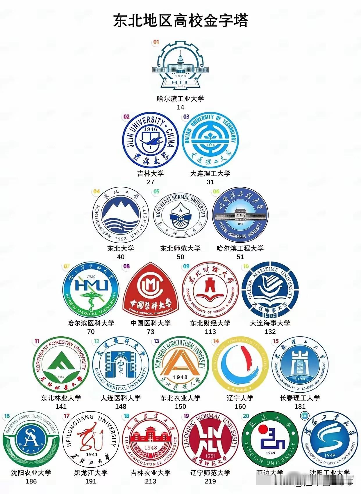 最近聊到东北,总有人吐槽经济不行,可一看当地的高校排行榜,那真是“瘦死的骆驼比马大”——高等教育这块,东北可一点没掉链子!网上流传的那张“东北地区高校金字塔”图,就特别直观:顶尖的哈尔滨工业大学稳坐塔尖,接着是吉林大学、大连理工大学,一层层排下来,像个金字塔似的,越往上学校越少,但实力越硬。 哈工大不用说,老牌名校,军工背景强,国内国际都响当当的。吉大和大连理工也都是985、211,科研、教学扎实得很。往下数,东北大学也是985、211、东北师范大学这些,也都在各自领域有头有脸。整体看,东北的好大学真不少,覆盖工科、理科、文科,虽然经济增速放缓,可教育底子几十年攒下来,不是随便就能被比下去的。 最让人意外的是延边大学!在金字塔里,它排到220名开外,按理说不太起眼,可人家偏偏是211高校。更“恐怖”的是,它居然培养出了浙大校长 马琰铭院士这样的校友——这可不是吹的,一个边疆地区的大学,能走出顶尖高校的掌门人和院士,说明啥?说明东北的大学藏着“扫地僧”,实力不能光看排名数字。 说到底,东北经济面临挑战,但高等教育这块招牌依旧闪亮。这些大学不光在本地有影响力,还为国家输送了大批人才。像延边大学的例子,就证明了很多学校可能名气不响,但底蕴深、后劲足。所以,别光盯着GDP数据,东北的大学,牛着呢!它们就像老工业基地里的“隐形引擎”,默默支撑着未来的希望。要是哪天经济回暖,这些高校的潜力爆发出来,那才叫真的“恐怖如斯”。