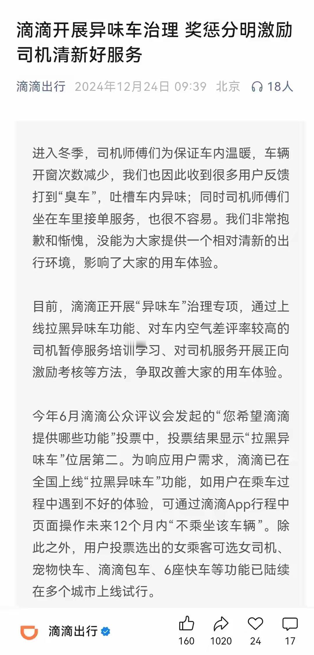 冬季网约车异味引关注,平台:启动车内清洁整治专项,提供免费清洁物料、洗车补贴。 每年冬季,网约车异味车问题引发关注。近日,各地不少市民发现,网约车平台正大力整治“臭车”。 每年冬季,随着气温的骤降,网约车内那股难闻的异味似乎成了乘客们的“头号烦恼”。有人说,这是“冬天的特殊味道”,但更多人知道,这其实是车辆长时间未彻底清洁、空气流通不畅的“隐形杀手”。在寒冷的季节里,一辆车的异味不仅影响心情,更关系到乘客的健康与安全。于是,平台开始“出手”了——启动车内清洁整治专项行动正式启动,免费提供清洁物料、洗车补贴,试图用行动解决“臭车”难题。 然而,这背后折射出的是怎样的行业责任感?又能否真正解决问题?我们不得不反思:这场“臭车风波”不仅仅是表面上的异味,更是行业服务品质的一个缩影。平台的回应固然及时,提供免费清洁物料和洗车补贴,显示出他们的责任心和积极作为,但更深层次的问题在于:为什么会出现如此普遍的“异味车”现象?难道是司机的疏忽,还是行业缺乏长效管理机制? 其实,异味车的出现,折射出的是一种“人性化管理”的缺失。司机们每天奔波在城市的角落,压力巨大,时间紧张,或许忽略了车辆的日常维护。而乘客们的体验,也变成了行业服务的“风向标”。当一辆车散发出异味,最先想到的不是司机的责任,而是整个行业的疏漏——为什么没有一个完善的管理体系来确保每一辆车都能保持清新整洁?这不仅仅是车辆的“美容问题”,更是对乘客健康的关心。 更值得一提的是,这场“整治行动”是否真能从根本上改善?免费清洁物料和洗车补贴固然好,但如果司机们没有养成良好的习惯,没有形成自我维护的意识,这些措施终究只能是“治标不治本”。或许,我们更需要的是一种“责任感的培养”和“服务意识的提升”。让每一位司机都明白,乘客的体验不仅关乎评分,更关系到他们的职业尊严。 这场“臭车事件”,其实也是一次行业自我反思的契机。我们期待的不仅是表面的“清洁”,更是从根源上提升整个行业的服务品质。毕竟,干净整洁的车内环境,不只是为了迎合乘客的“感官享受”,更是对生命健康的尊重。希望每一位司机都能意识到:用心维护车辆,就是对乘客最真诚的关怀。只有这样,冬季的“异味”才能真正成为过去式,而我们期待的,是一个更专业、更有人情味的出行环境。网约车除臭攻略 臭车网约车