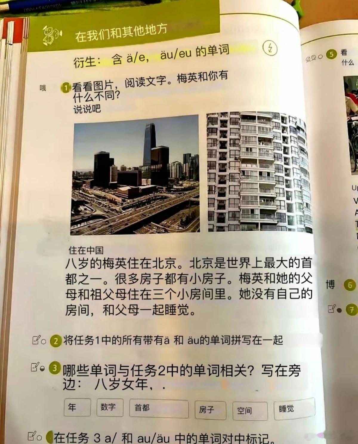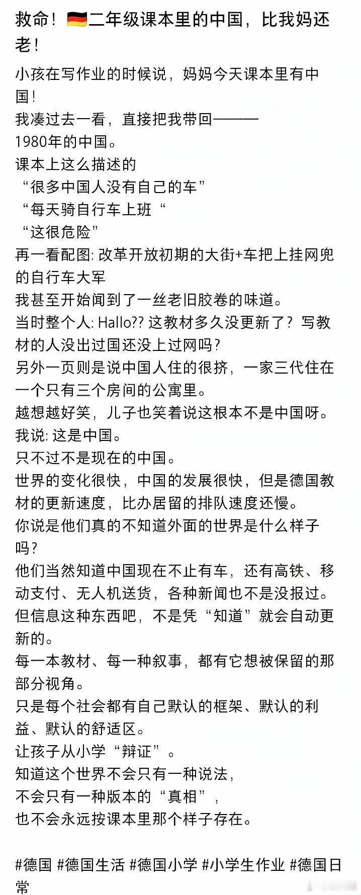 德国 【德国小学课本中这样介绍中国!】一位在德国的华人在社交平台配图发文说,她读小学二年级儿子的课本里,介绍中国竟然还停留在那个满大街二八大杠、根本买不起汽车的年代! 这都2025年了,他们对中国的认知还停留在上世纪80年代,比博主她妈的年纪都大。下面摘抄一点这位在德华人博文的内容:(二年级课本里的中国,比我妈还老!小孩在写作业的时候说,妈妈今天课本里有中国!我凑过去一看,直接把我带回———1980年的中国。课本上这么描述的:“很多中国人没有自己的车”“每天骑自行车上班“这很危险”再一看配图:改革开放初期的大街+车把上挂网兜的自行车大军我甚至开始闻到了一丝老旧胶卷的味道。当时整个人:写教材的人没出过国还没上过网吗?另外一页则是说中国人住的很挤,一家三代住在一个只有三个房间的公寓里。越想越好笑,儿子也笑着说这根本不是中国呀。我说:这是中国。只不过不是现在的中国。世界的变化很快,中国的发展很快,但是德国教材的更新速度,比办居留的排队速度还慢。你说是他们真的不知道外面的世界是什么样子吗?他们当然知道中国现在不止有车,还有高铁、移动支付、无人机送货,各种新闻也不是没报过。但信息这种东西吧,不是凭“知道”就会自动更新的。每一本教材、每一种叙事,都有它想被保留的那部分视角。只是每个社会都有自己默认的框架、默认的利益、默认的舒适区。)德国人办事一向被人称赞“严谨”,可这小学课本把德国人的“严谨”干得稀碎!不过,从政治的角度看,为了认识战的需要,德国这样做或许正是他们“严谨”的一种表现形式。