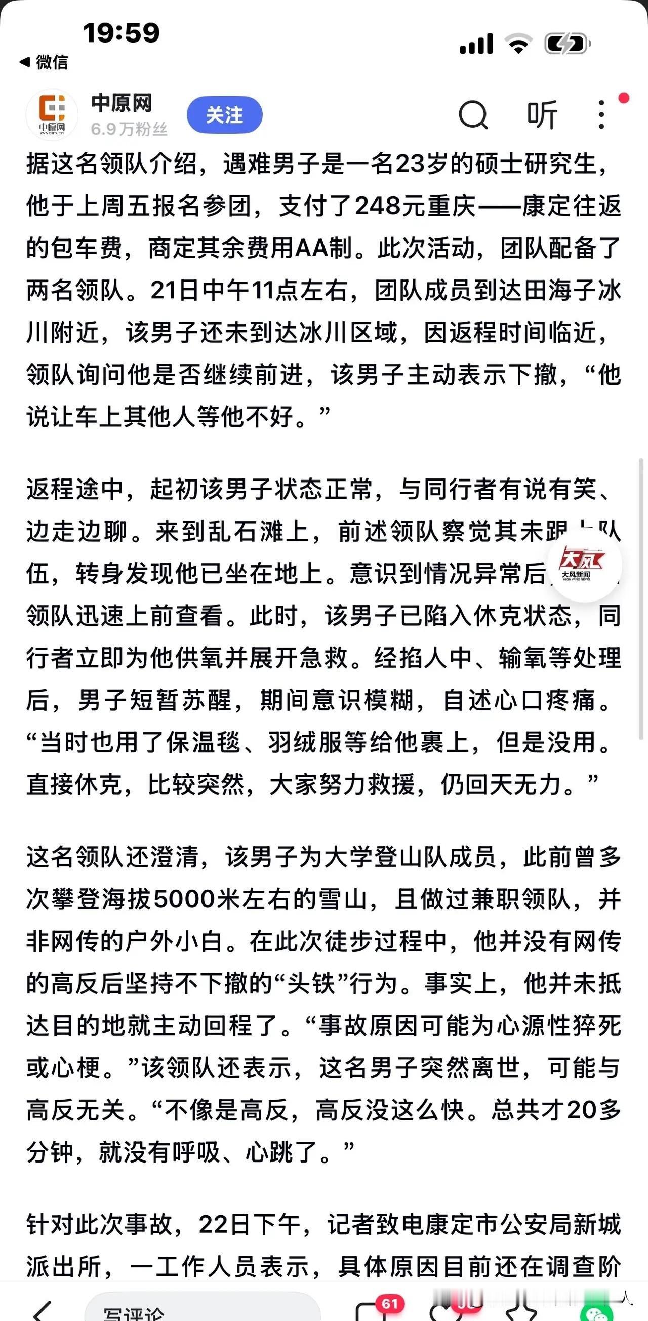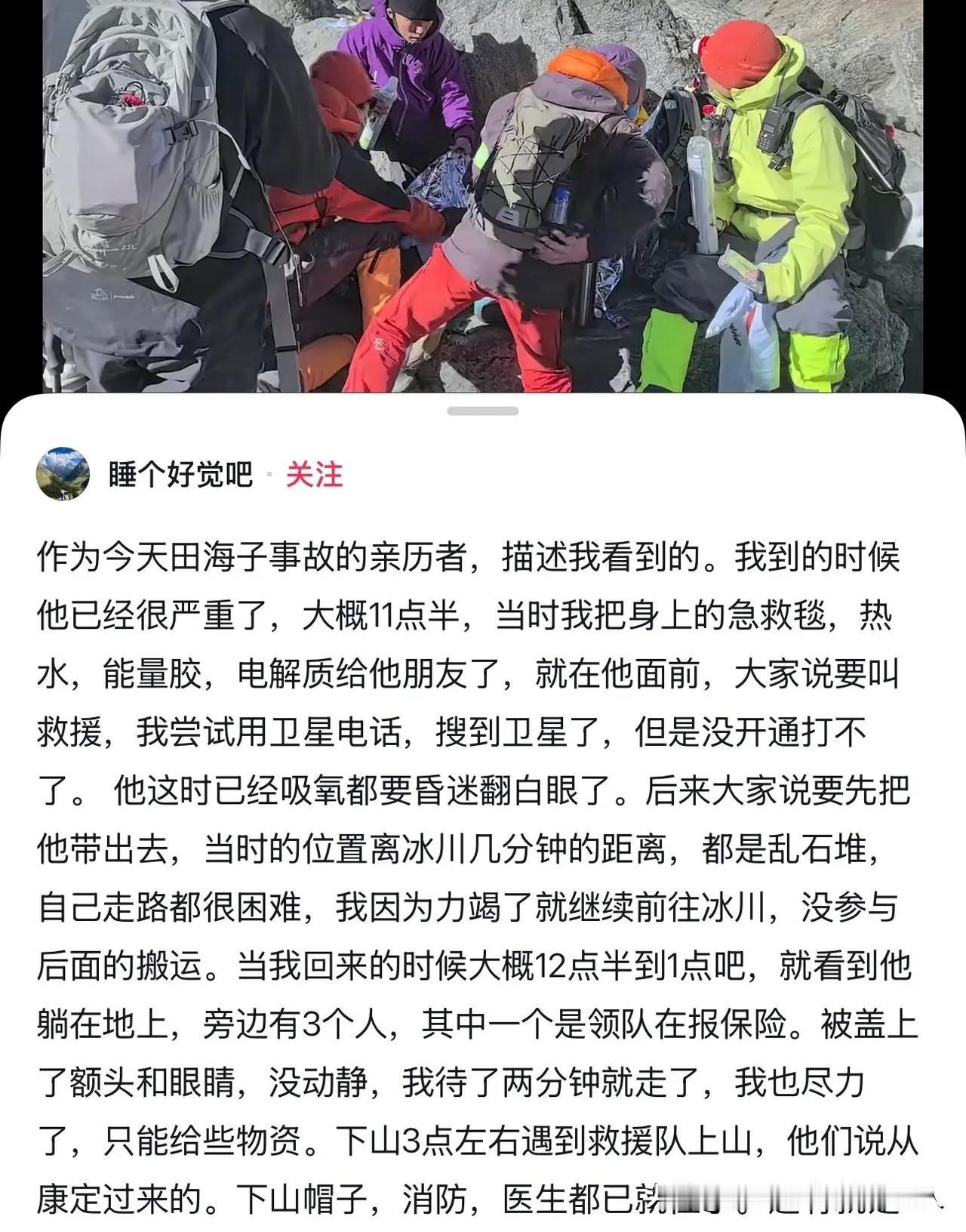 23岁研究生登山遇难,一幕太揪心! 刷到23岁研究生登山遇难前的视频,真的让人揪心!视频里他大张着嘴,只有出气没有进气,是典型的潮汐式呼吸,生命正快速流逝。 当时雪山风景绝美,谁也没料到危险悄然而至。众人急忙给他裹保温毯、穿保暖衣,有人大喊“坚持住”“别睡”,蓝衣女子赶紧递上氧气瓶按压供氧,可他意识昏沉,不知是否吸进氧气。从出现症状到离世,不到半小时,年轻生命就此陨落。 据悉,他周五参团登山,下撤时落在后面,在乱石堆突发休克。队友急救后他短暂苏醒,说胸口剧痛。领队称他并非登山小白,是大学生登山队队员,推测可能是心源性猝死或心梗,具体原因还待调查。 个人看法:登山探险虽有魅力,但生命安全永远是第一位。无论经验多少,都要敬畏自然、做好万全准备,团队更要完善应急保障机制。愿逝者安息,也提醒大家户外出行务必把风险防控放在首位!