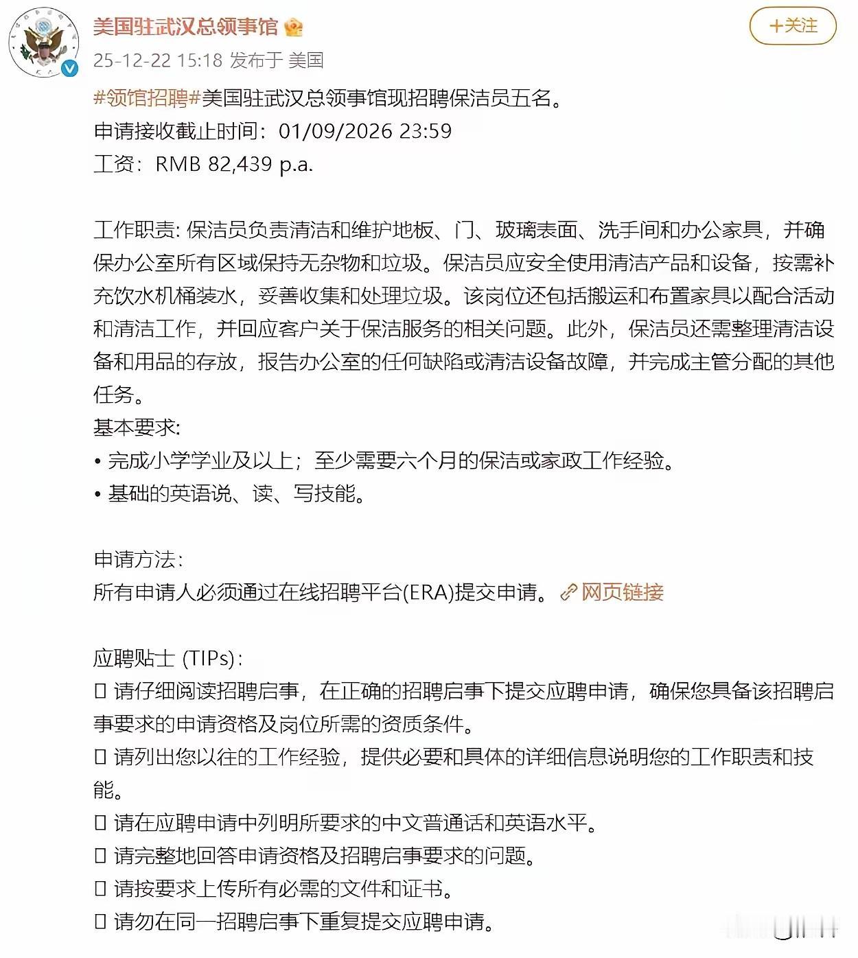 保洁员,工资8万多,有双休、八小时工作制、五险一金。 任职要求小学,有六个月的保洁经验,基础英语能听、读、写还要会维修办公室的设备。还有普通保洁的所有工作内容,比如拖地打扫卫生,厕所清洁,桶装水的更换等等还要配合主管交待的其它事情。 虽然学历要求不高,其他要求都挺高,要会维修还要会英语全能选手,应该找个211或985学机械的来。