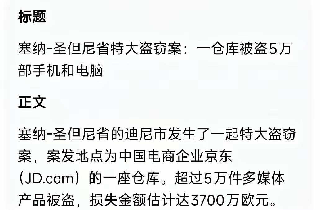 京东仓库被盗,3700万欧元(3亿人民币)货物被盗!震惊全欧洲! ​​据悉,中国电商企业京东位于塞纳-圣但尼省迪尼镇的仓库遭到洗劫,这座距离巴黎市区约17公里的物流枢纽 仓库凌晨被撬开,监控也被提前损坏,整个过程没有留下任何影像记录,报警系统也没有发出任何报警信号。 这些被盗货物中,90%是手机、电脑、平板电脑等主流数码产品,剩余10%为耳机等配件,初步估算损失金额高达3700万欧元,折合人民币约3.06亿元。 对仓库了如指掌,不用想肯定有内鬼,要不监控报警系统,不会轻而易举的破坏,这么多货物需要大车运输,路上到处都是摄像头。 在中国案子想破轻易而举。到处摄像头监控,而且咱们的帽子叔叔办事那个快。 现在压力给到法国,这样的案子,都破不了?法国警察能力堪忧!这么大体量的盗窃,这么多人车参与,简直处处是破绽,想查根本跑不了!