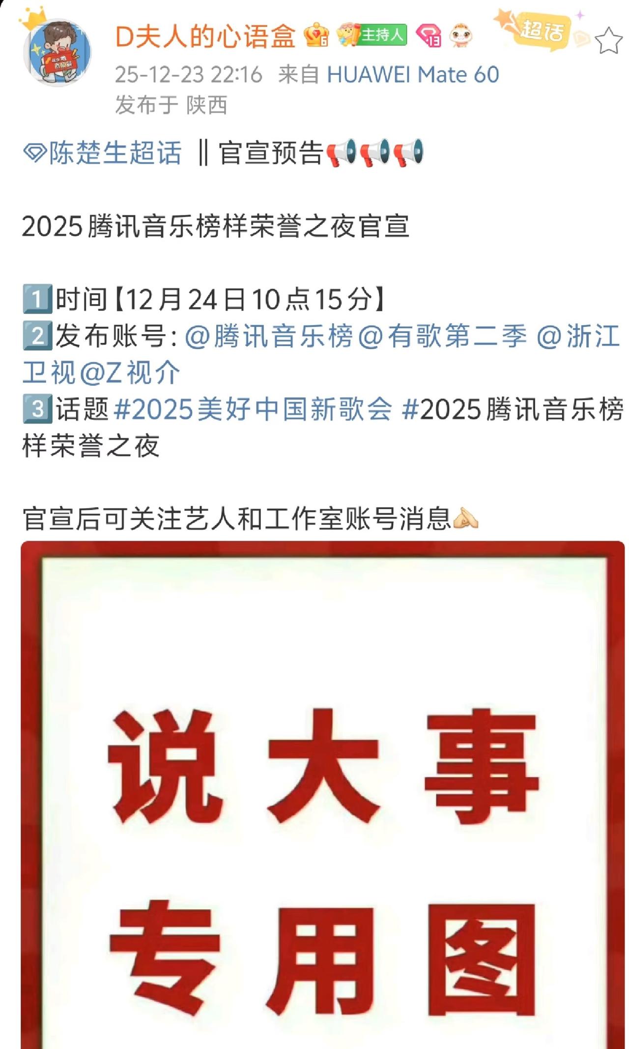 陈楚生2025腾讯音乐榜样荣誉之夜官宣! 这个月真的是很幸福,好事连连“花”生。 不仅有两场演唱会、🈶两首新歌、有影响力领奖和新综艺,更还有晚会和跨年夜! 这不,前期录制的2025腾讯音乐榜样荣誉之夜就要来了!嗨起来,花生们。