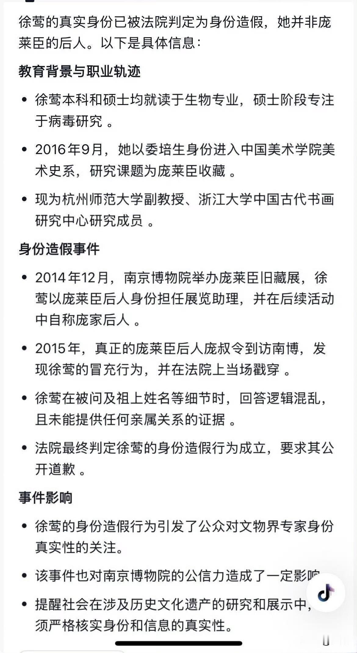 徐莺曾试图借画展之机接近庞莱臣后人庞叔令,企图坐实自己“庞家后人”的身份,不料被眼明心细的庞叔令察觉端倪。 早在2014年12月,南京博物院举办庞莱臣旧藏展时,徐莺就以“庞莱臣后人”的身份担任展览助理,此后也一直对外自称庞家后人。庞叔令起疑后,不仅查阅了庞氏族谱,还核查了户籍登记信息,很快发现徐莺的言辞存在诸多漏洞,其所述的亲属关系并无任何实际依据。2015年,庞叔令到访南京博物院,当场戳穿了徐莺的冒充行为,随后相关事件进入司法程序。在法庭上,徐莺被问及祖上姓名等关键细节时逻辑混乱,也无法提供任何能证明亲属关系的证据,最终法院判定其身份造假行为成立,并要求她公开道歉。 徐莺的教育背景与书画研究领域并无早年关联,其本科和硕士均就读于生物专业,硕士阶段甚至专注于病毒研究,2016年才以委培生身份进入中国美术学院美术史系研究庞莱臣收藏相关课题,却在此之前就急于冒充庞家后人,其行为更显刻意。 庞叔令作为庞家的代言人,始终对曾祖父庞莱臣的文物心血保持关注,即便文物已捐献,仍秉持严谨负责的态度守护家族遗产,也正因这份正直,让这场身份造假的闹剧得以被及时揭穿。