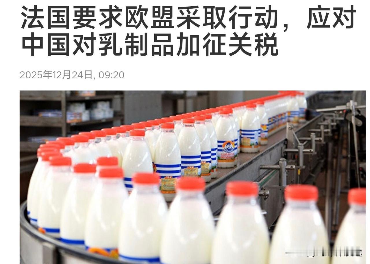 12 月 22 日 中国决定对欧盟乳制品征收关税震惊了欧洲,法国第一个跳出来 要求欧盟对中国采取反制行动! 中国商务部12月22日发布公告,初步裁定原产于欧盟的进口相关乳制品,包括鲜乳酪及凝乳、加工乳酪、稀奶油等存在补贴。中方决定自23日起对相关产品收取临时反补贴税保证金,比率最高为42.7%。 法国为什么这么急着跳出来反对中国呢?乳制品对于法国来说是重要的财政收入来源之一,而中国又是法国乳制品的重要市场: 2024年,法国向中国出口的乳制品(包括黄油、牛奶和奶酪)总价值约为3.7亿欧元,其中黄油出口量占欧盟对华出口总量的50% 2025年前10个月,中国自法国进口的乳制品及婴幼儿奶粉总量为8.8万吨,金额为36亿元人民币 2023年,法国对华奶酪出口量为6306吨,占欧盟对华奶酪出口的主要份额 这就说明了,法国的乳制品中国是主要的市场 ,就如 2023年法国对华奶制品出口额达7.76亿欧元,乳制品占法国对华农产品出口的较大比重。 虽然就在本月初,法国总统马克龙刚刚结束他对中国的访问,带着核能、航空零部件等12项合作协议满载而归,但这只能说明了中国与法国之间的贸易得到了加强与提升,但法国并不能代表整个欧盟,而欧盟对中国的“不公平性“依然严重存在。 法国是欧盟的主要成员,而欧盟对中国单方面的电动汽车加征关税及对中国电动汽车“反补贴调查”,以此企图将中国电动汽车挤出欧洲市场,中方反复与欧盟进行沟通,但对欧盟依然没有改变对中国商品打压的举动。 2025年前11个月,欧盟乳制品对华出口额同比增长了18%,而同期中国本土乳企的同类产品市场份额却下滑了5个百分点。这种此消彼长的情况,恰恰说明了不公平补贴对市场秩序的扭曲。中方的反制措施,旨在让进口成本回归合理区间,为国内企业创造一个公平的竞争环境。除了法国,包括新西兰等国都是乳制品生产国,而中国市场都是这些国家的主要目的地! 这就可以得出结论,为什么法国第一个跳出来要求欧盟对中国采取反制的国家!但是如果欧盟借此再对中国商品进行反制的话,必将再次动遥中欧贸易关系!