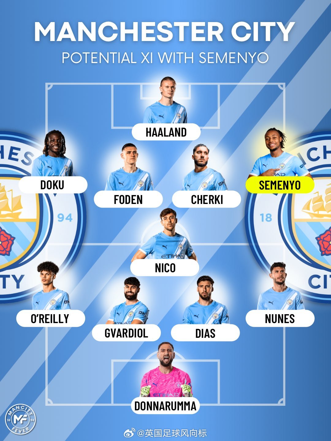 【如虎添翼】假如塞梅约在一月冬窗最终加盟曼城,瓜迪奥拉的球队在下半赛季的首发阵容,会不会变成下图这样?前锋替补:马尔穆什边锋替补:萨威尼奥、鲍勃中场替补:赖因德斯、B席、罗德里、科瓦契奇这样的中前场配置,是否足以推动曼城四线作战,与阿森纳争冠?