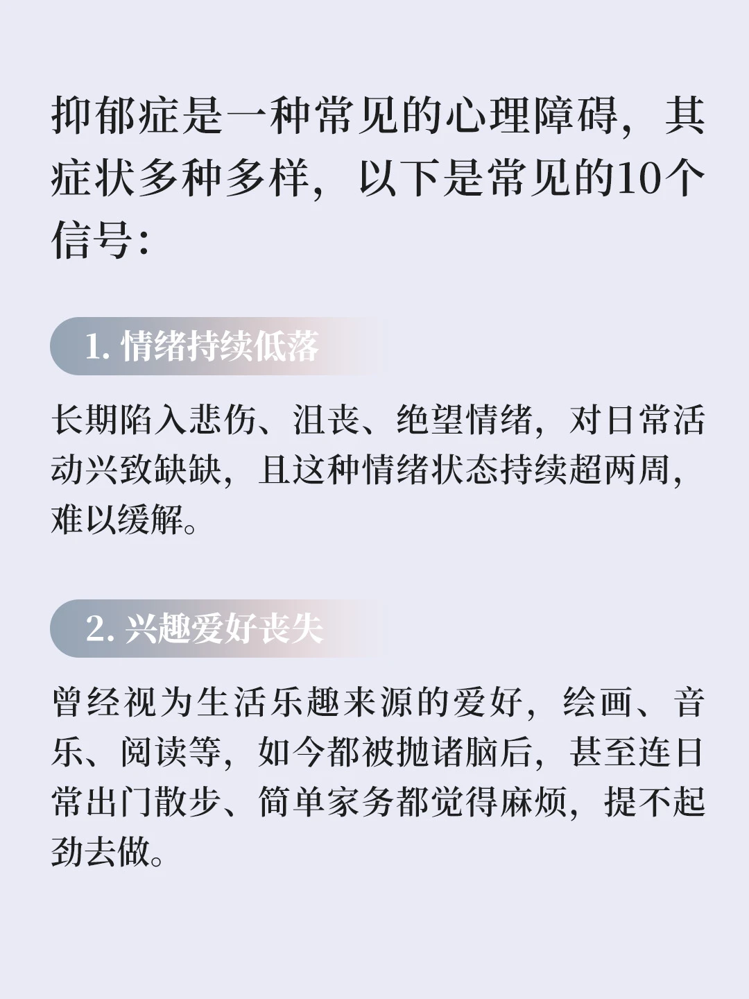 抑郁症是一种常见的心理障碍,其症状多种多样,以下是常见的10个信号: