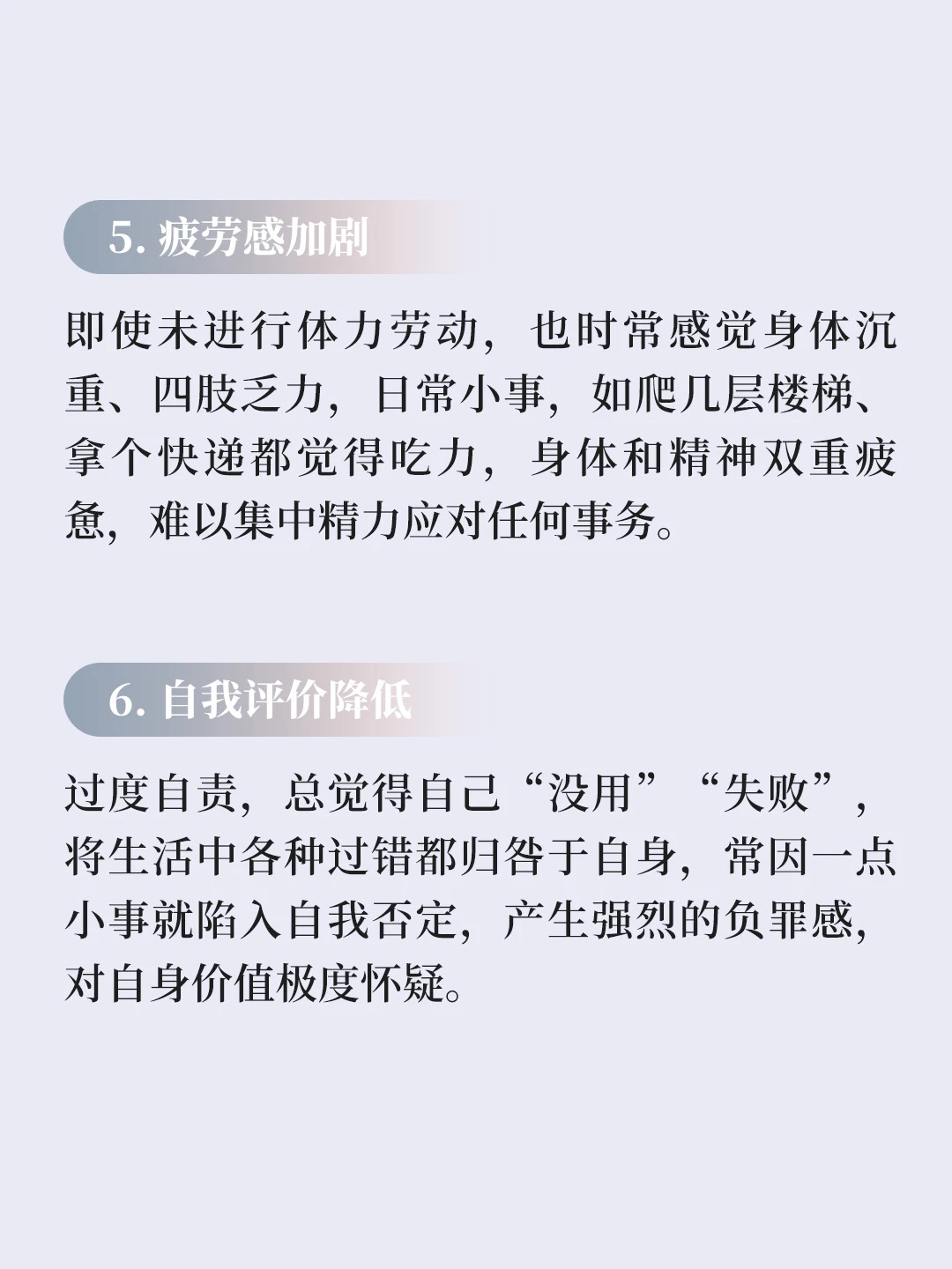 即使未进行体力劳动,也时常感觉身体沉重、四肢乏力,日常小事,如爬几层楼梯、拿个快递都觉得吃力,身体和精神双重疲惫,难以集中精力应对任何事务。