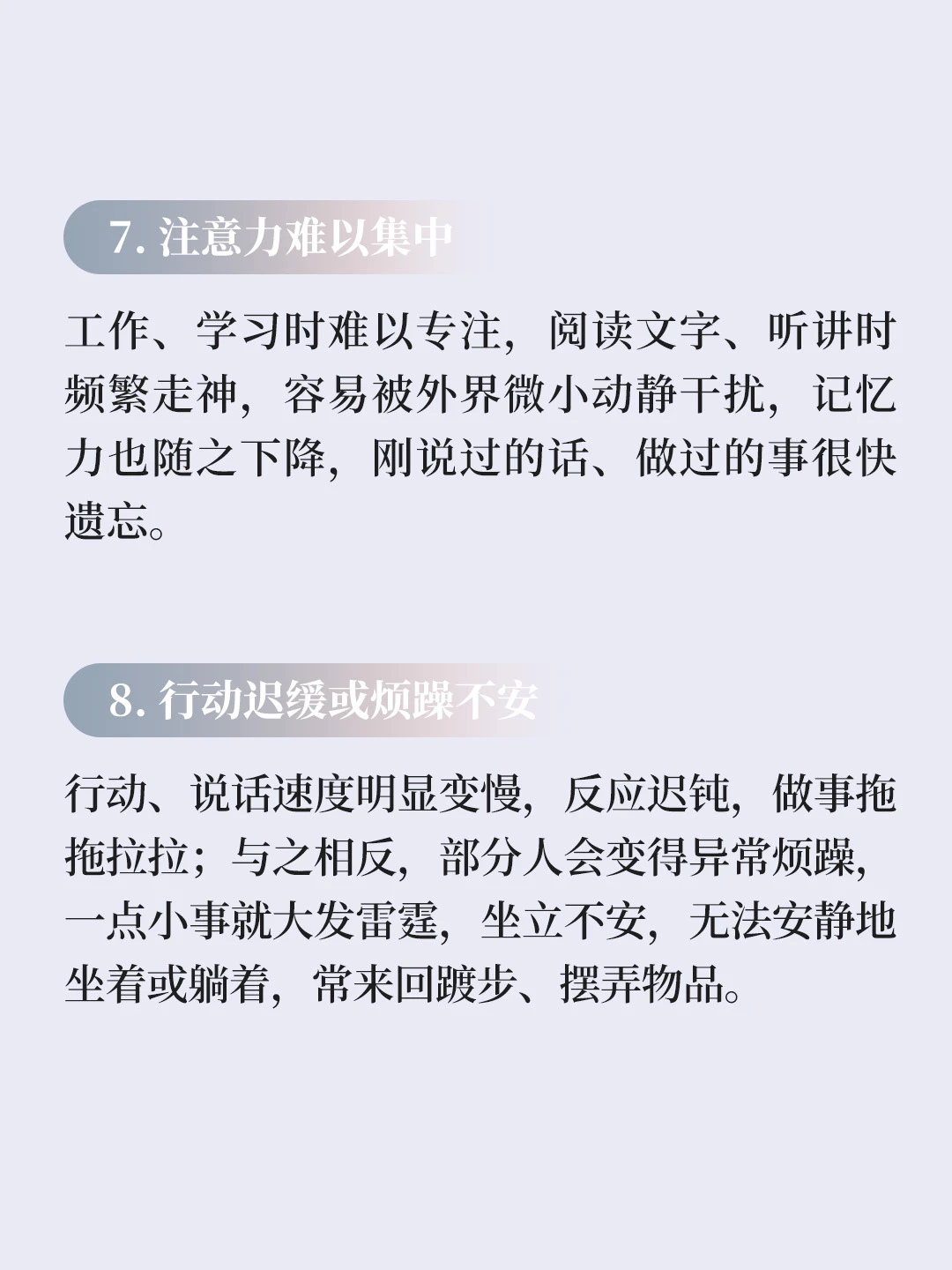 行动、说话速度明显变慢,反应迟钝,做事拖拖拉拉;与之相反,部分人会变得异常烦躁,一点小事就大发雷霆,坐立不安,无法安静地坐着或躺着,常来回踱步、摆弄物品。