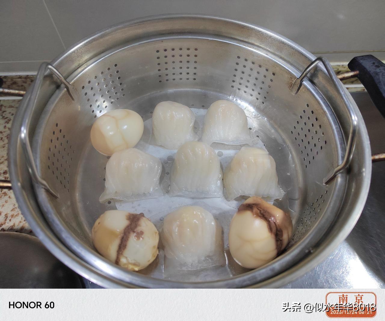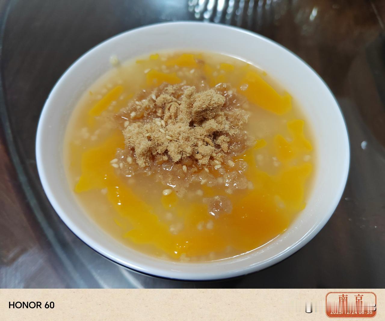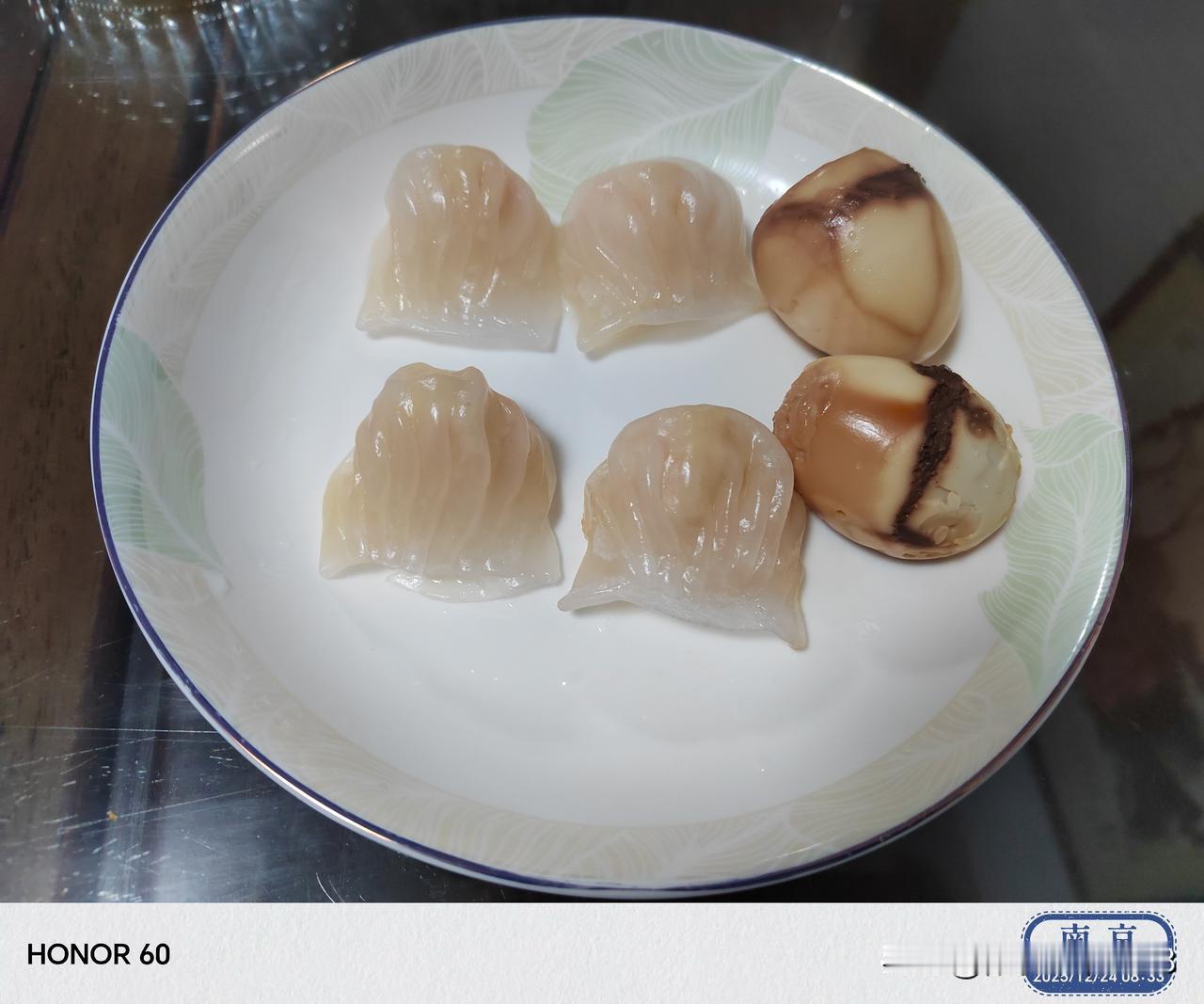今天是2025年12月24日,南京市天气阴天,温度4~7℃。今天气象台发布了寒潮蓝色预警,受强冷空气影响,明后天的最低气温降到零下2~3℃。 我和老伴今天的早餐:小米南瓜粥、手工虾饺、茶叶蛋。 早上六点钟起来一下用电饭锅煮小米南瓜粥,里面放点红枣和莲子,电饭锅煮粥时间要一个半小时,煮好自动保温。弄好电饭锅继续上床躺着休息。 七点半起来蒸虾饺,虾饺是女儿从网上买的陶陶居冷冻饺子,茶叶蛋是昨天煮的,今天拿出来重新热一下就可以吃。 早上没有炒菜,用榨菜、肉酥就着小米南瓜粥吃,也还不错,热呼呼的早餐下肚,一天都精神满满。 南京天气 南京气候变化 南京冬天风景 南京冷空气 阴天南京