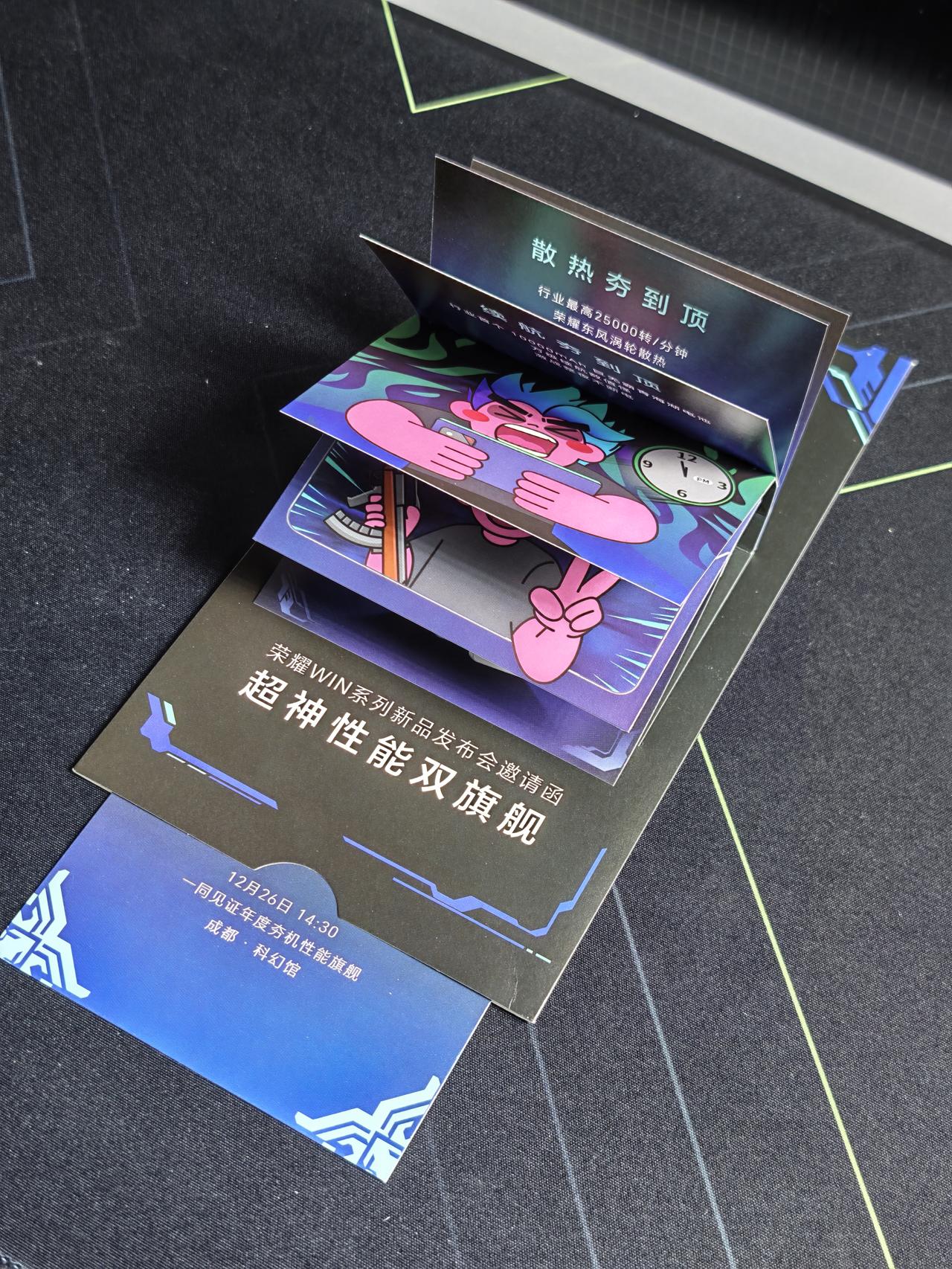 荣耀好会玩梗,荣耀WIN发布会邀请函,直接来了个嬴证,抽拉式卡片,直接展示了配置信息,很有趣。 还别说,10000mAh青海湖大电池、25000转的风扇、第五代骁龙8至尊版、超声波指纹……这些配置,直接赢麻了。 现在就等12月26日发布了,盲猜会成游戏爆款机。