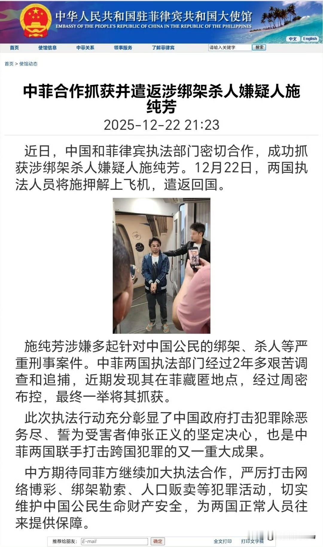 中菲合作抓获并遣返涉绑架杀人嫌疑人施纯芳! 近日,中国和菲律宾执法部门密切合作,成功抓获涉绑架杀人嫌疑人施纯芳。12月22日,两国执法人员将施押解上飞机,遣返回国。 施纯芳涉嫌多起针对中国公民的绑架、杀人等严重刑事案件。中菲两国执法部门经过2年多艰苦调查和追捕,近期发现其在菲藏匿地点,经过周密布控,最终一举将其抓获。 此次执法行动充分彰显了中国政府打击犯罪除恶务尽、誓为受害者伸张正义的坚定决心,也是中菲两国联手打击跨国犯罪的又一重大成果。 中方期待同菲方继续加大执法合作,严厉打击网络博彩、绑架勒索、人口贩卖等犯罪活动,切实维护中国公民生命财产安全,为两国正常人员往来提供保障。