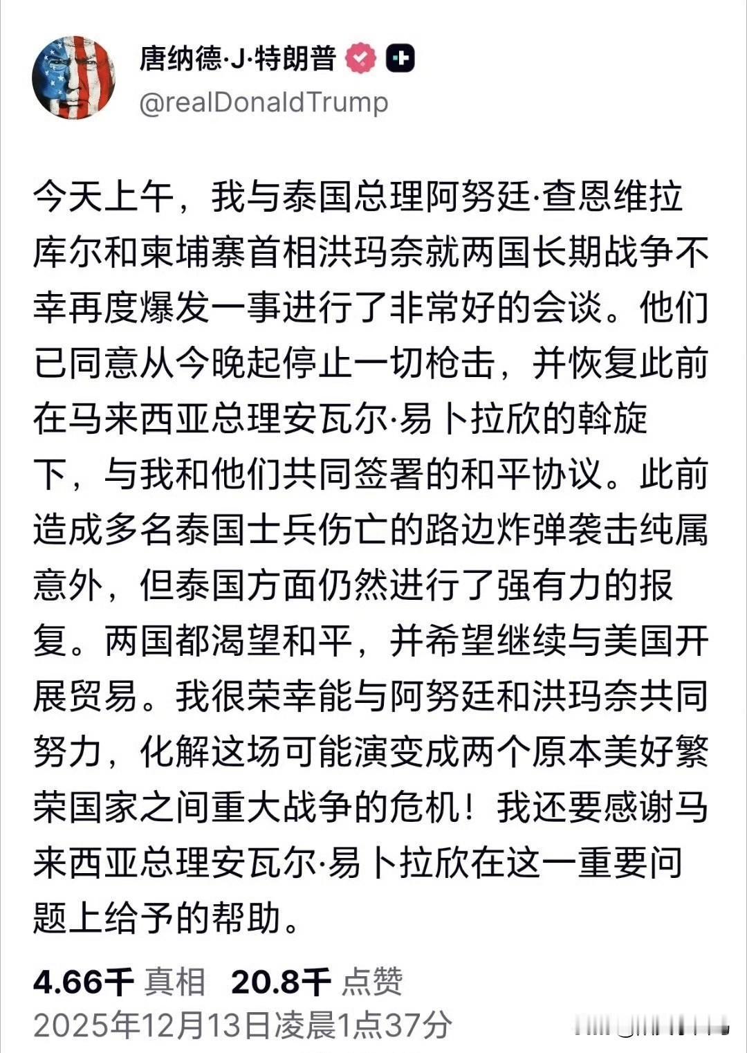 特朗普称,泰国和柬埔寨领导人同意停火! 通话后特朗普发文: 今天上午我与泰国总理阿努廷·参威拉恭、柬埔寨总理洪玛奈举行了十分愉快的会谈,议题关乎两国之间这场不幸重燃的长期争端。双方已同意于今晚全面停火,回归此前在马来西亚总理安华·易卜拉欣的协助下,由我与他们共同促成的原有和平协议。最初造成多名泰国士兵伤亡的路边炸弹事件实属意外,但泰国方面仍采取了强硬的报复行动。目前,两国均已做好准备,致力于实现和平,并继续与美利坚合众国开展贸易往来。能与阿努廷和洪玛奈携手化解这场本可能演变为两大美好繁荣国度间大规模战争的危机,我深感荣幸!同时,我也要感谢马来西亚总理安华·易卜拉欣在此重大事件中提供的协助。