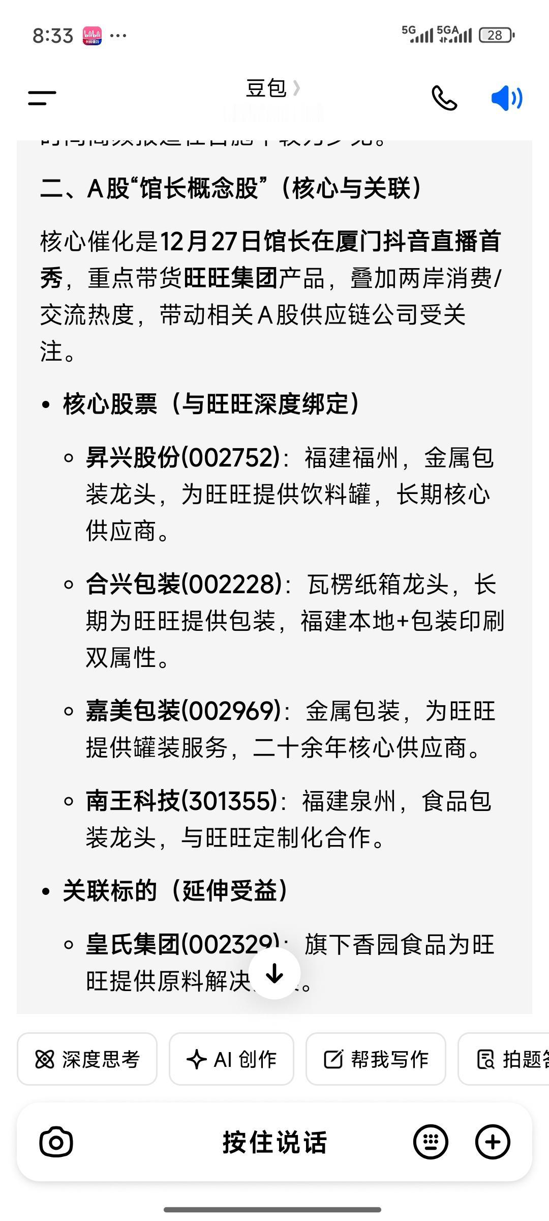 前几日纳入关注的几只包装股票,今日依旧大幅上涨。尤其是嘉美包装,再度一字涨停,已连续收获6个涨停板。合兴包装和昇行股份也都涨停。我一直不解这背后的逻辑,反复查阅资料,还询问了豆包,原来其中涉及“馆长概念”。当下“馆长”话题热度颇高,且准备在周末开展带货直播。于是我让豆包梳理了所有与馆长带货相关的核心股票,供大家参考。大家不妨深入挖掘,看看是否还有参与的机会。 长盈包装股票 志旺包装 台湾网红馆长入驻抖音你会关注吗 馆长 旺旺